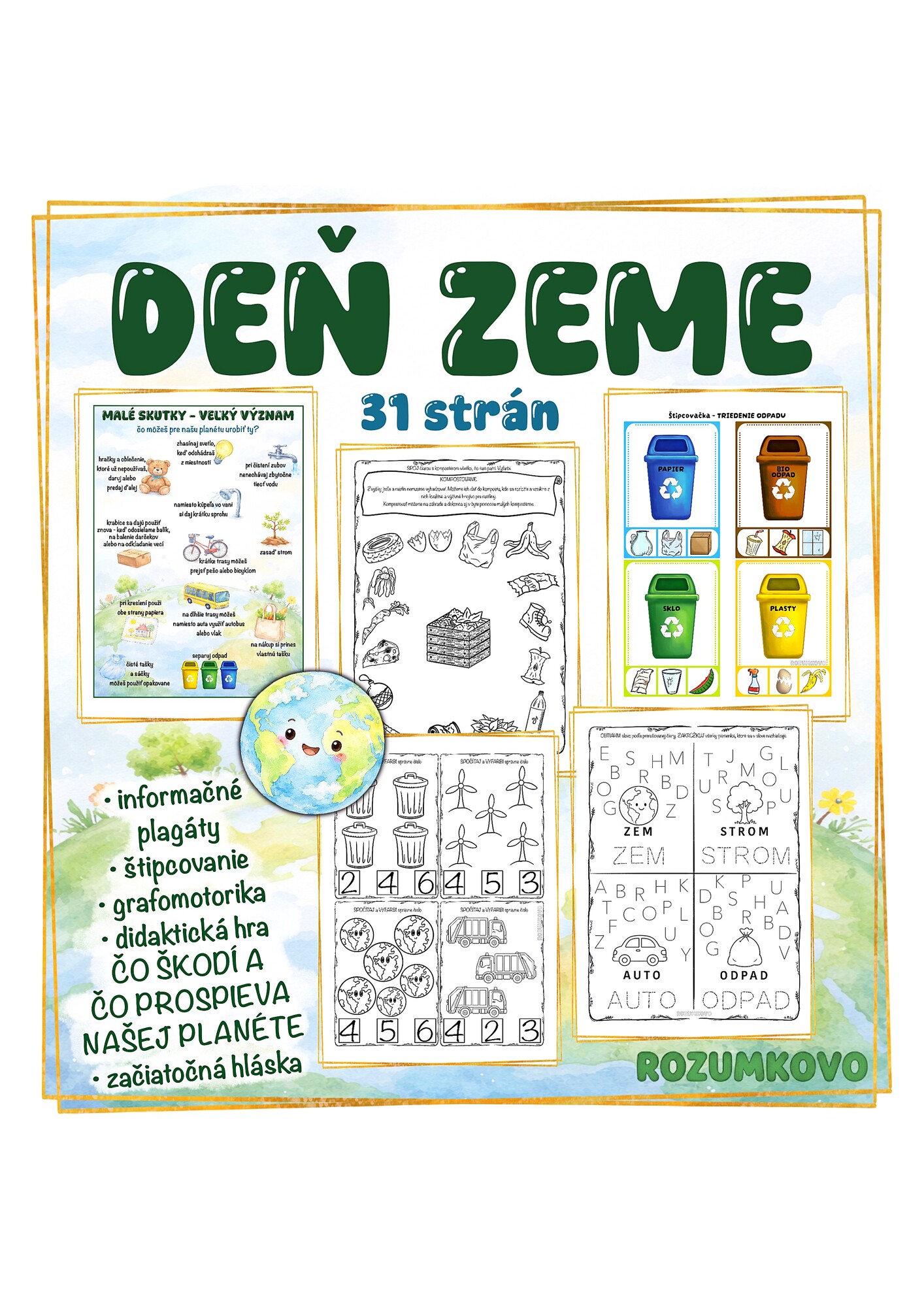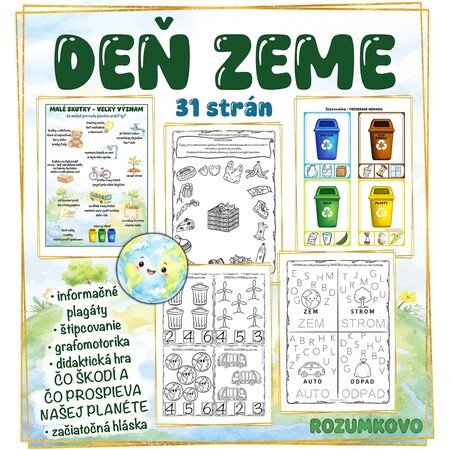 Komplexný súbor s 31 stranami rôznorodých aktivít ku DŇU ZEME, ktoré hravou formou rozvíjajú environmentálne povedomie detí a vedú k vytváraniu základných návykov šetrného správania voči prírode 🌍