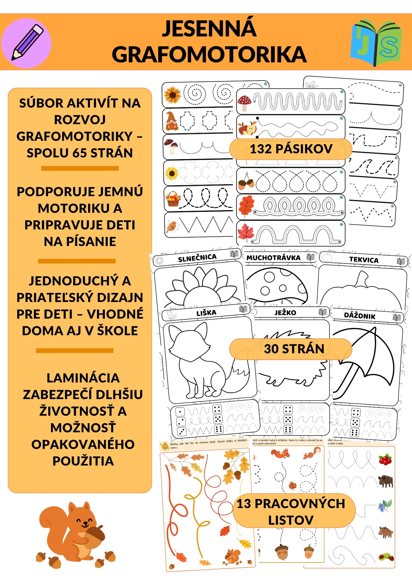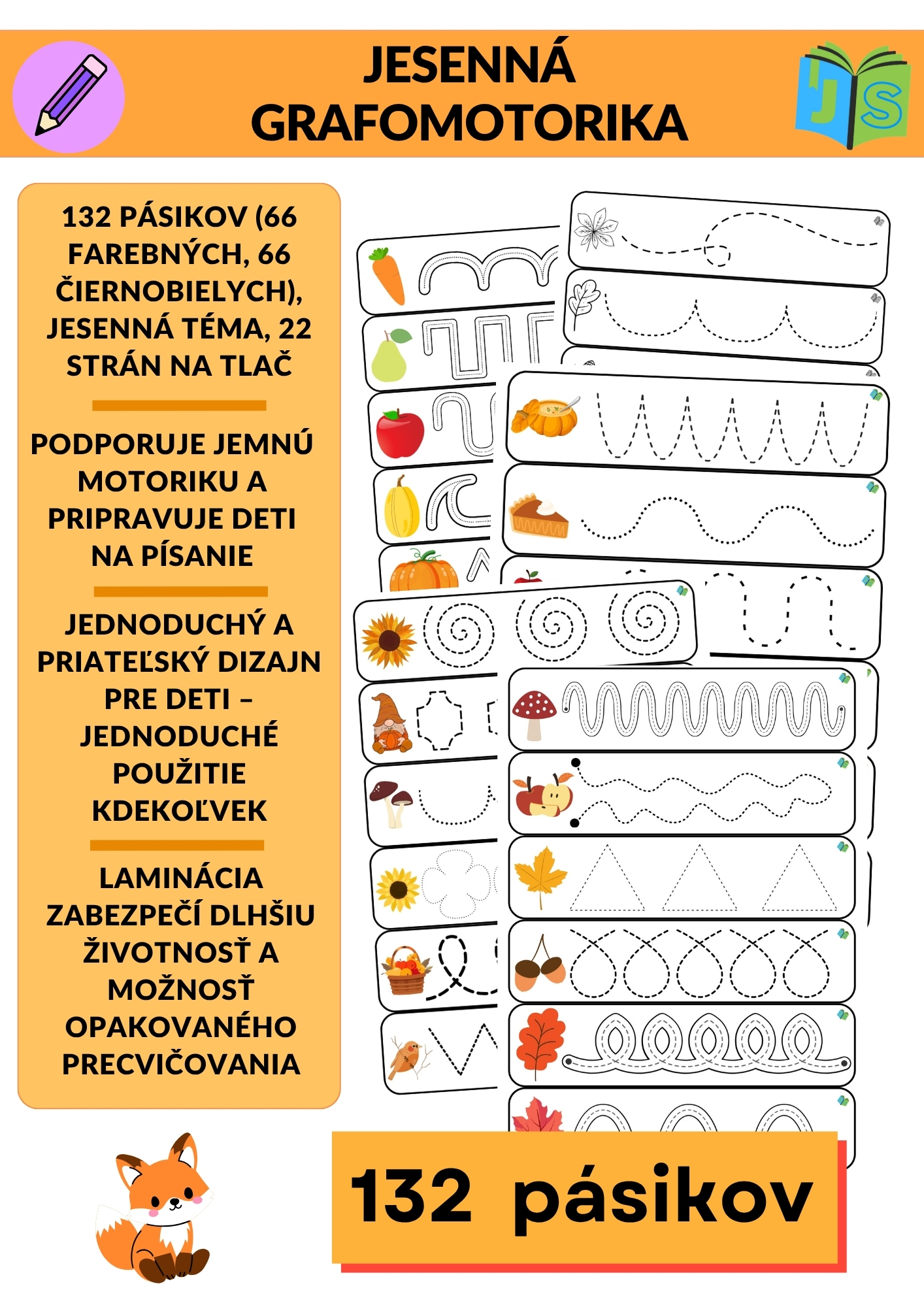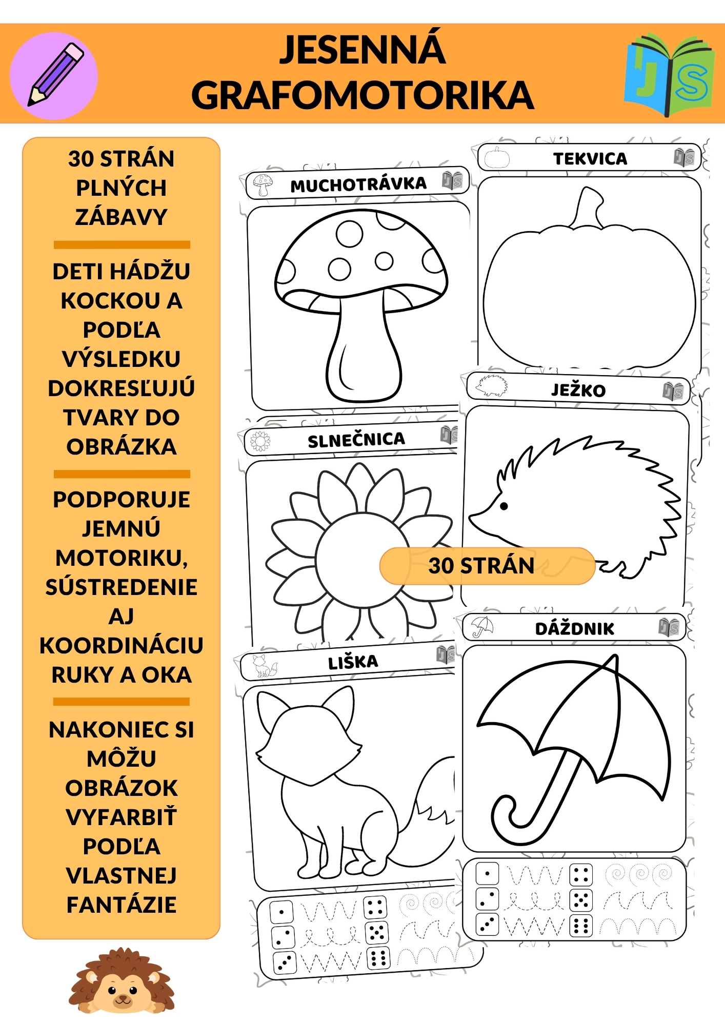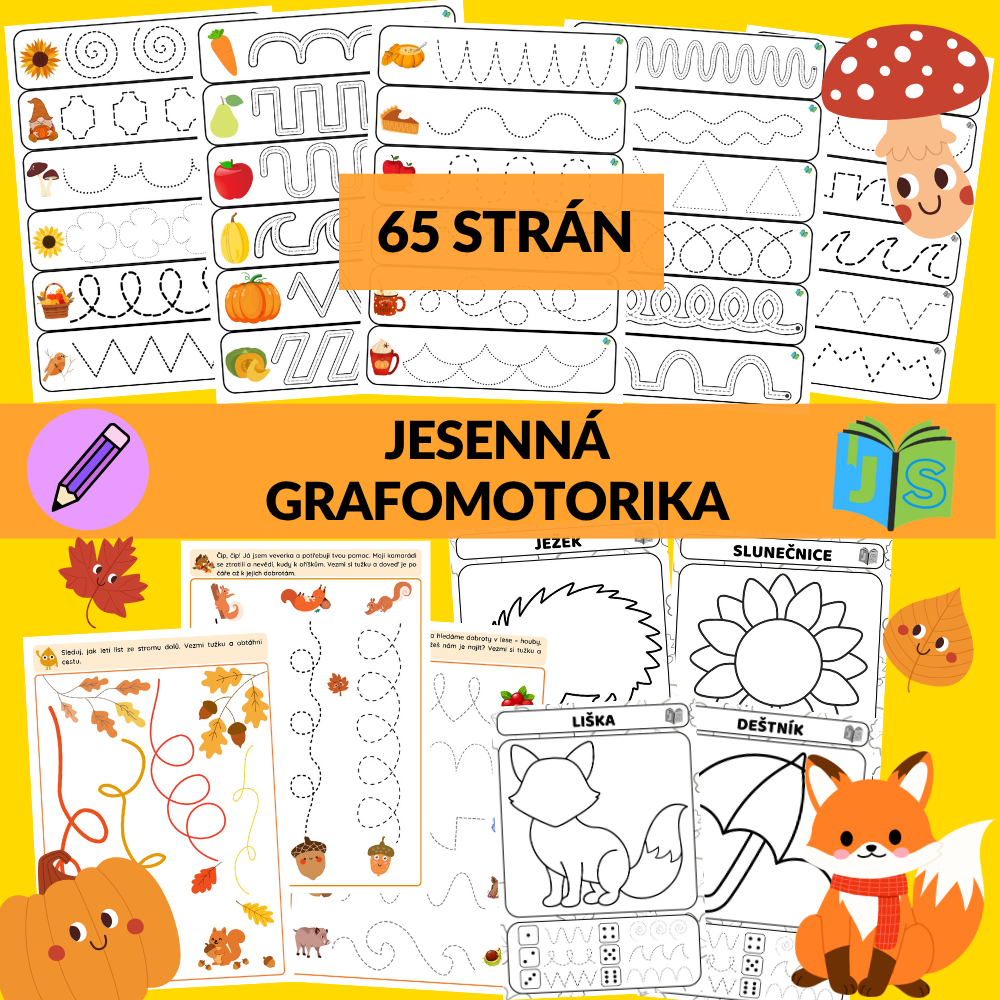 Súprava prináša deťom 65 strán zábavných a variabilných aktivít. Nájdete tu 132 pásikov s jesennými motívmi (vo farebnej aj čiernobielej verzii), 30 obrázkov s kockou, kde deti hádžu a dokresľujú tvary do obrázkov, a 13 pracovných listov s cestičkami a spájaním.