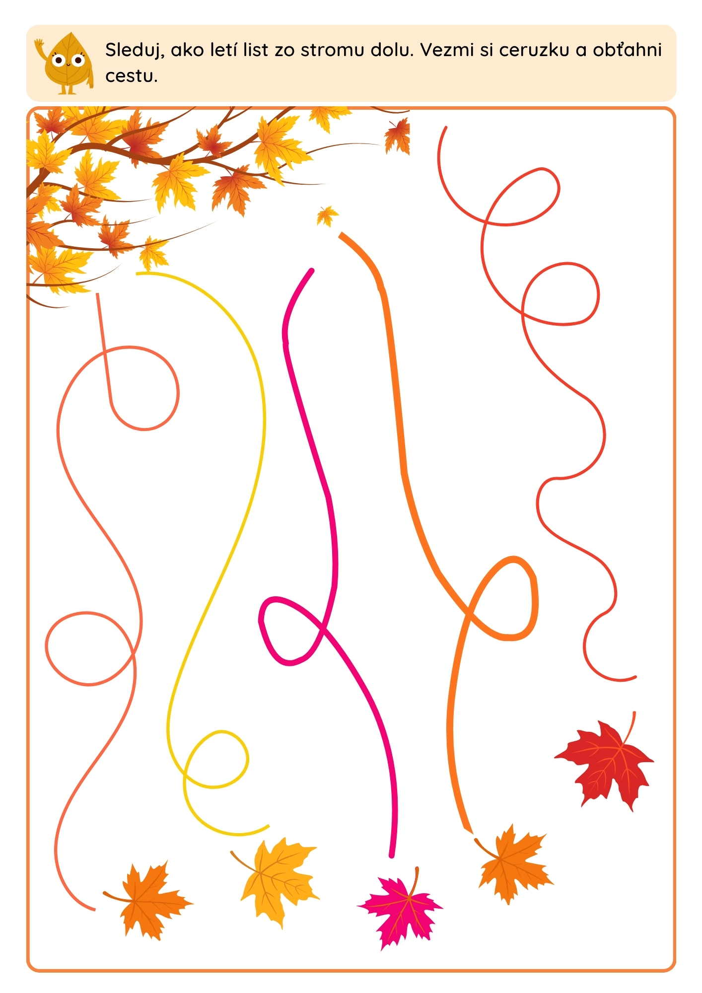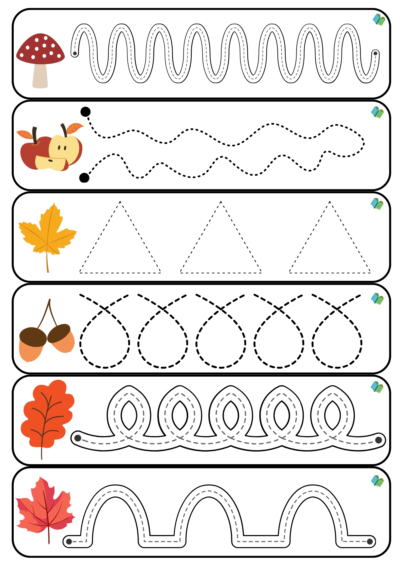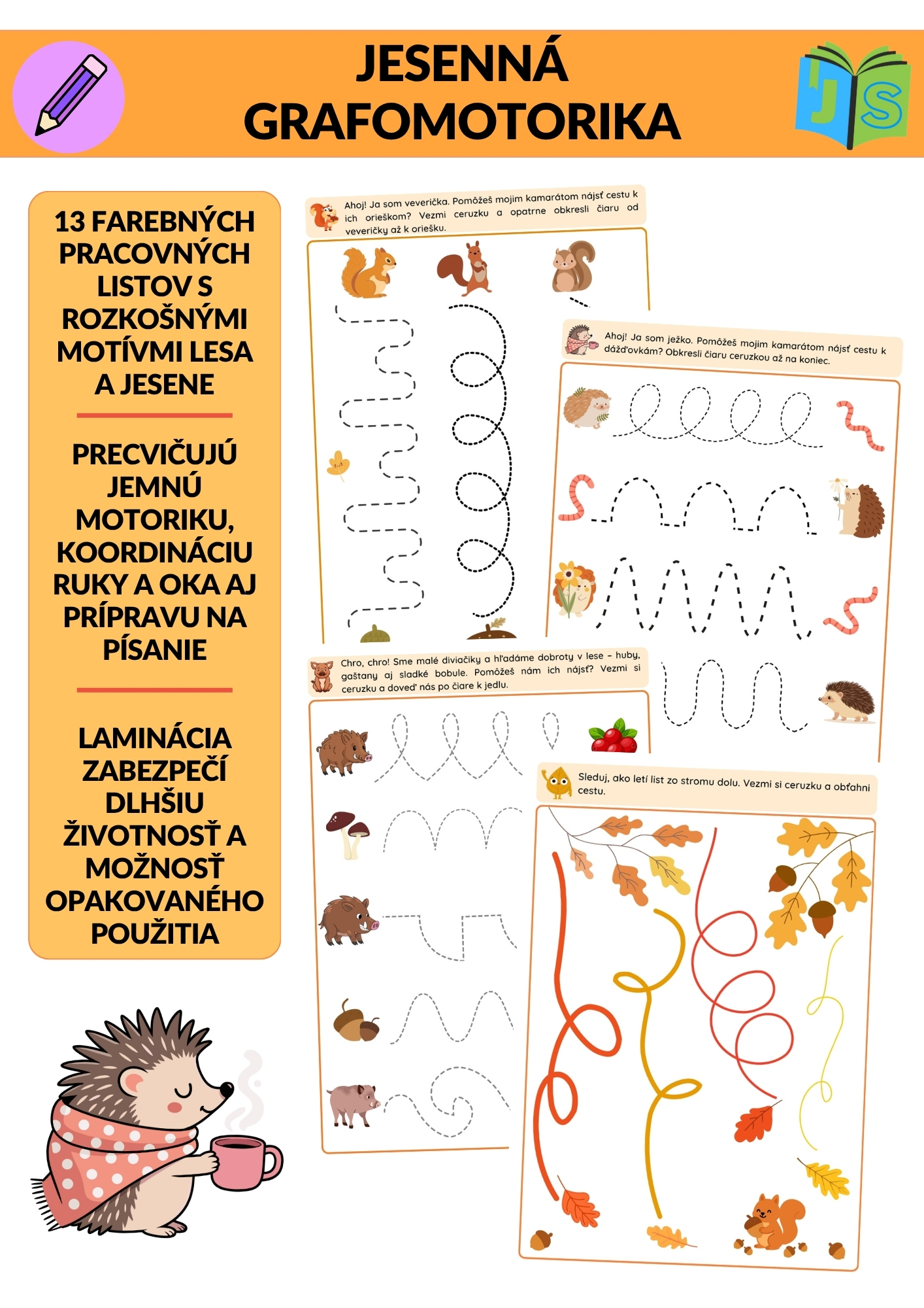Súprava prináša deťom 65 strán zábavných a variabilných aktivít. Nájdete tu 132 pásikov s jesennými motívmi (vo farebnej aj čiernobielej verzii), 30 obrázkov s kockou, kde deti hádžu a dokresľujú tvary do obrázkov, a 13 pracovných listov s cestičkami a spájaním.
