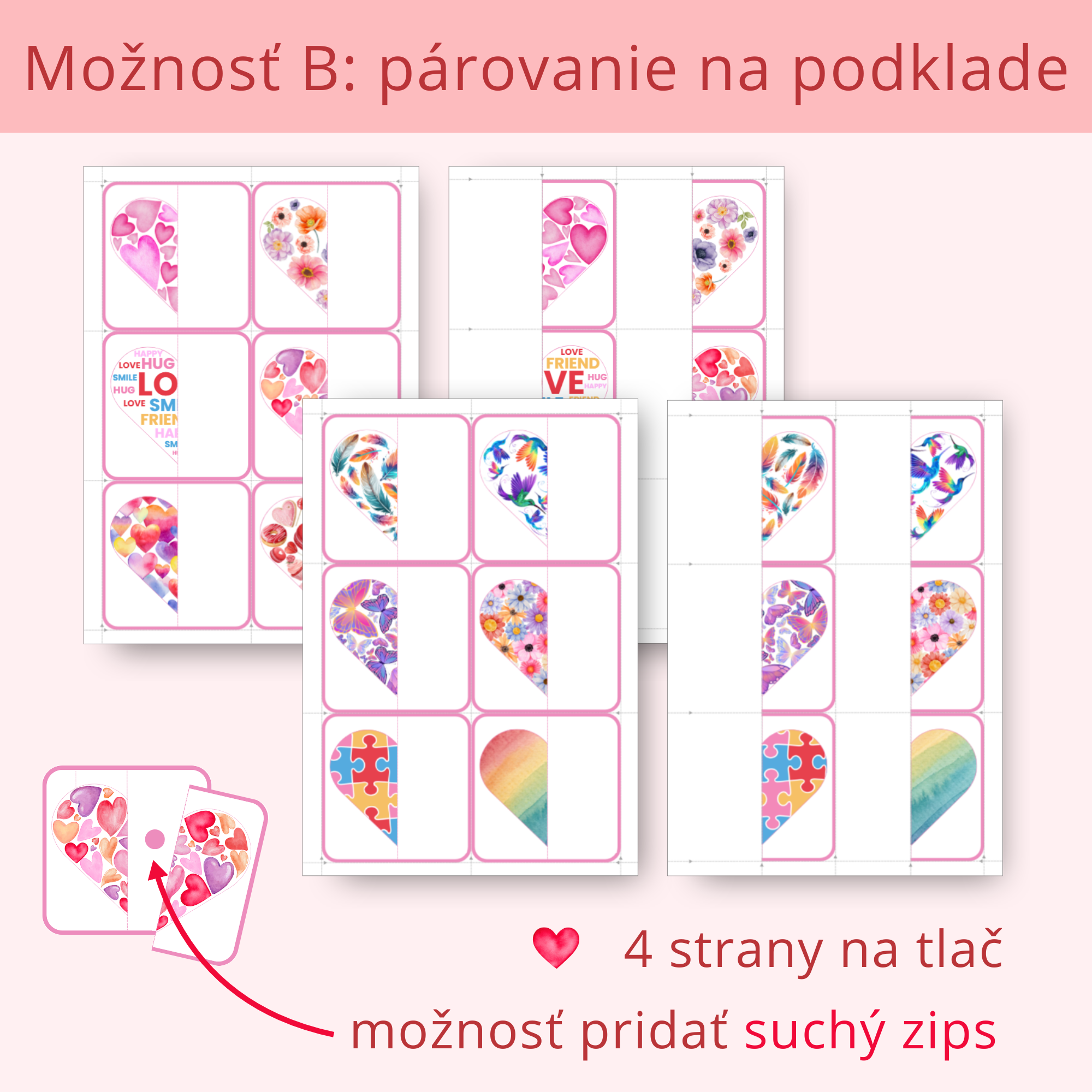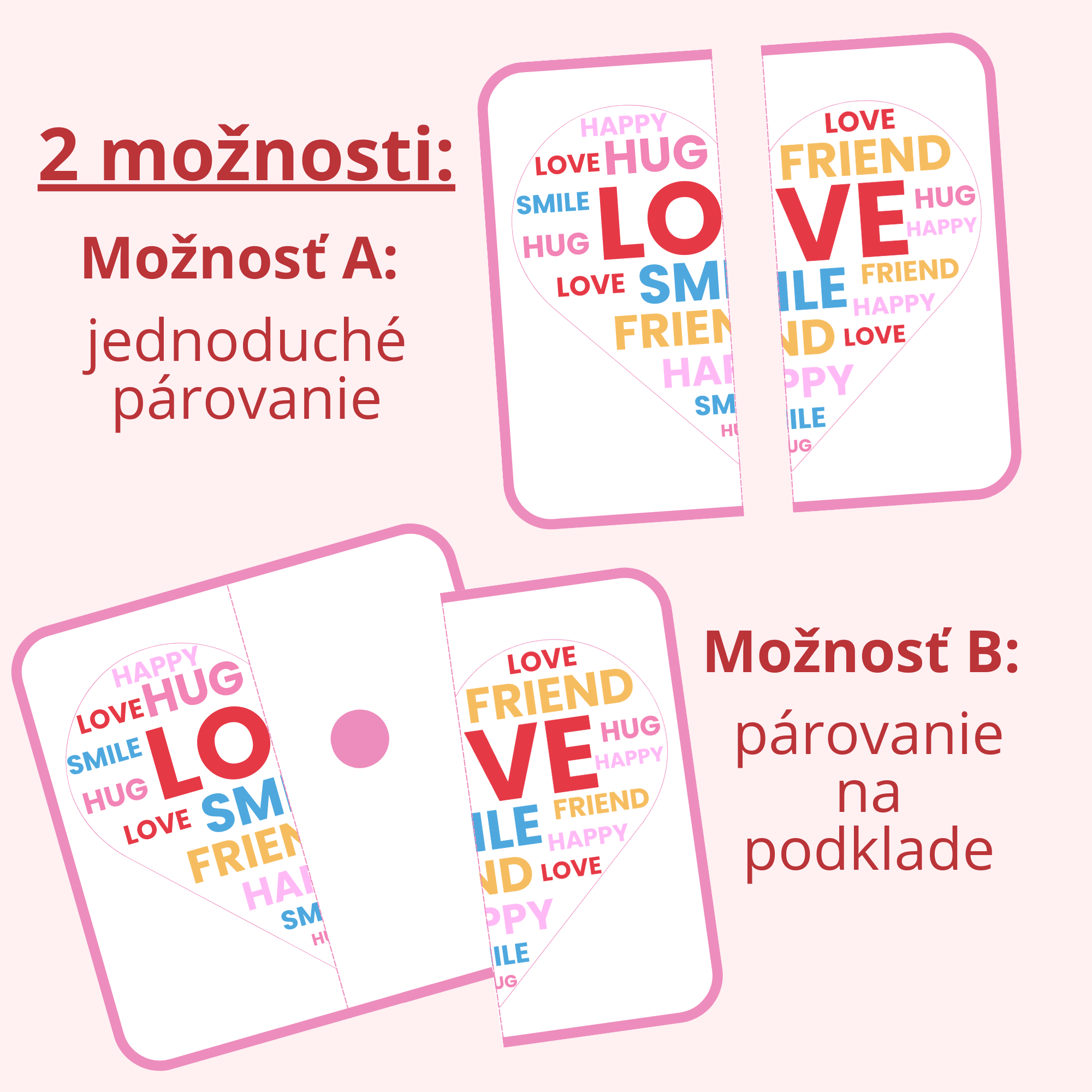 Jedna polovica srdca je zobrazená na podkladovej kartičke. Dieťa k nej hľadá a prikladá správnu druhú polovicu (odporúčame použiť suchý zips).