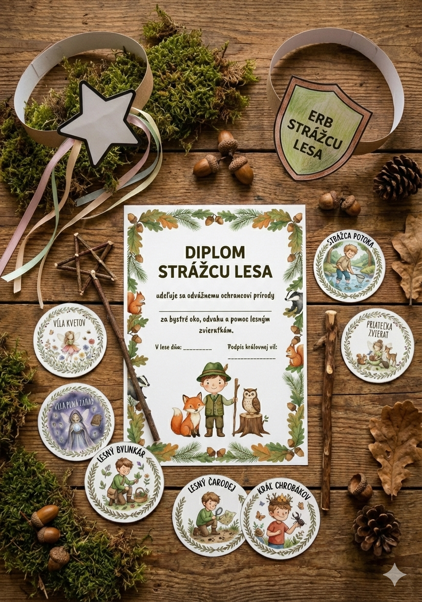 - ✅ Tvorivé šablóny: Šablóna hviezdy na čarovnú paličky a Erb strážcu lesa na výrobu štítov.