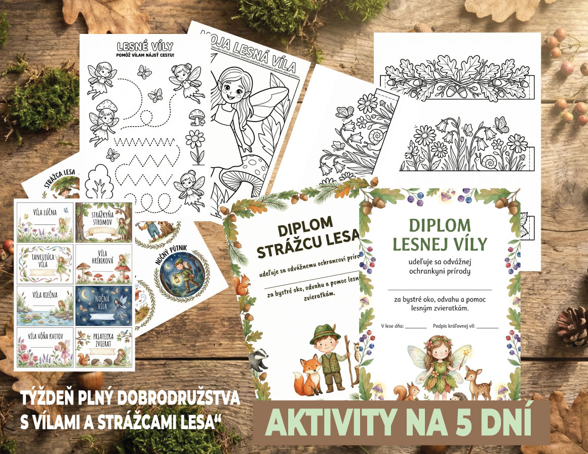 - ✅ Kompletný metodický program: Rozpis aktivít na 5 dní – od environmentálneho čistenia lesa až po miešania kúzelných lektvarov a výstavbu domčeka pre víly.