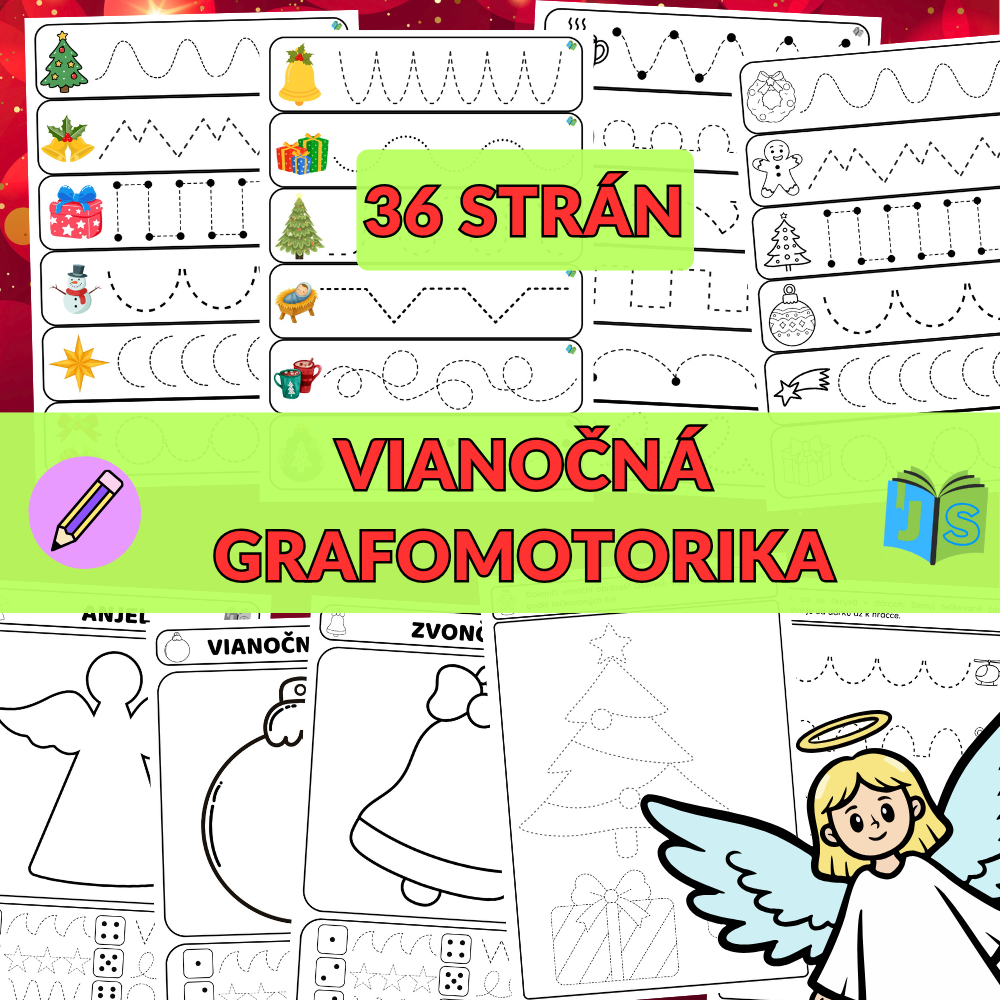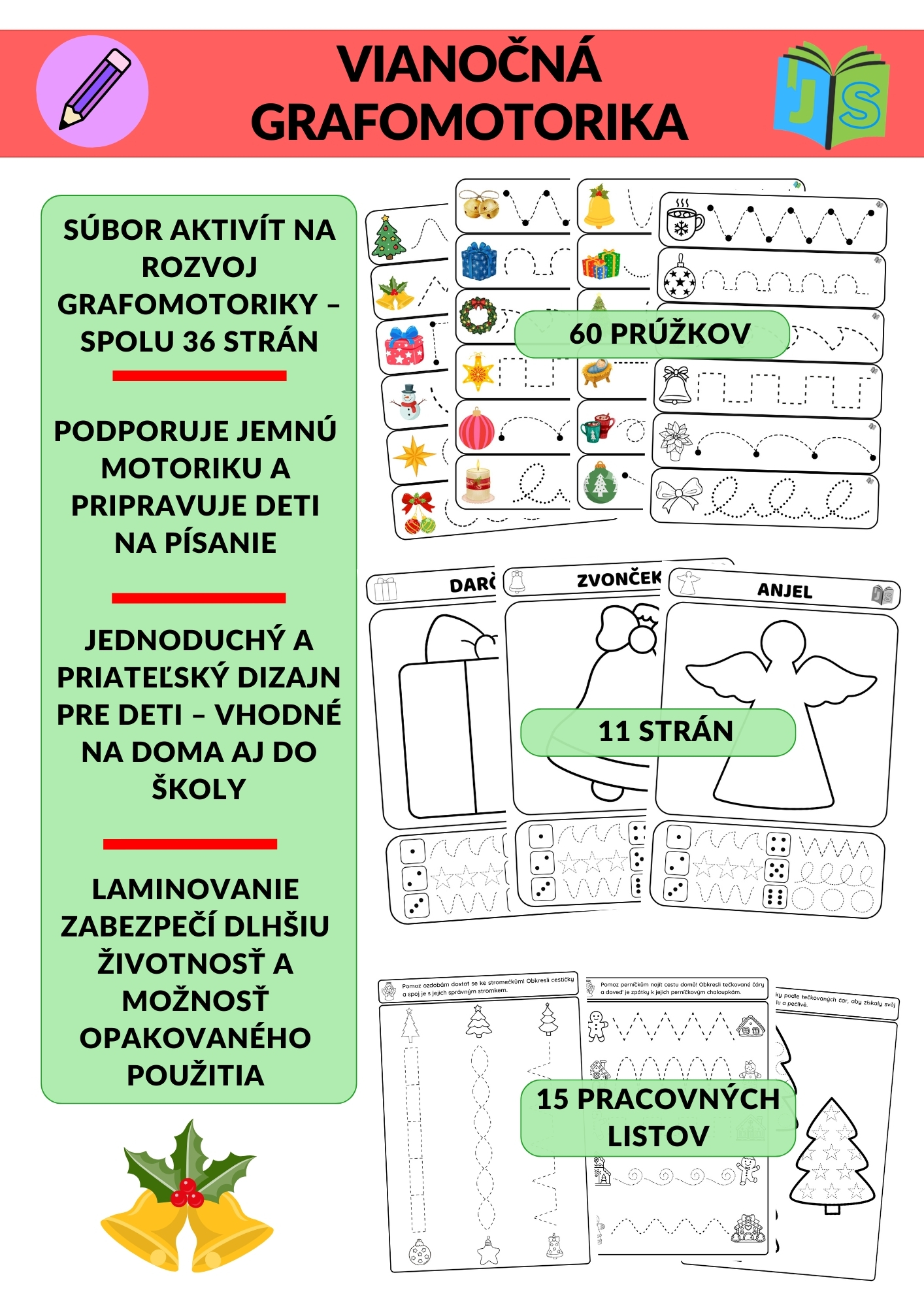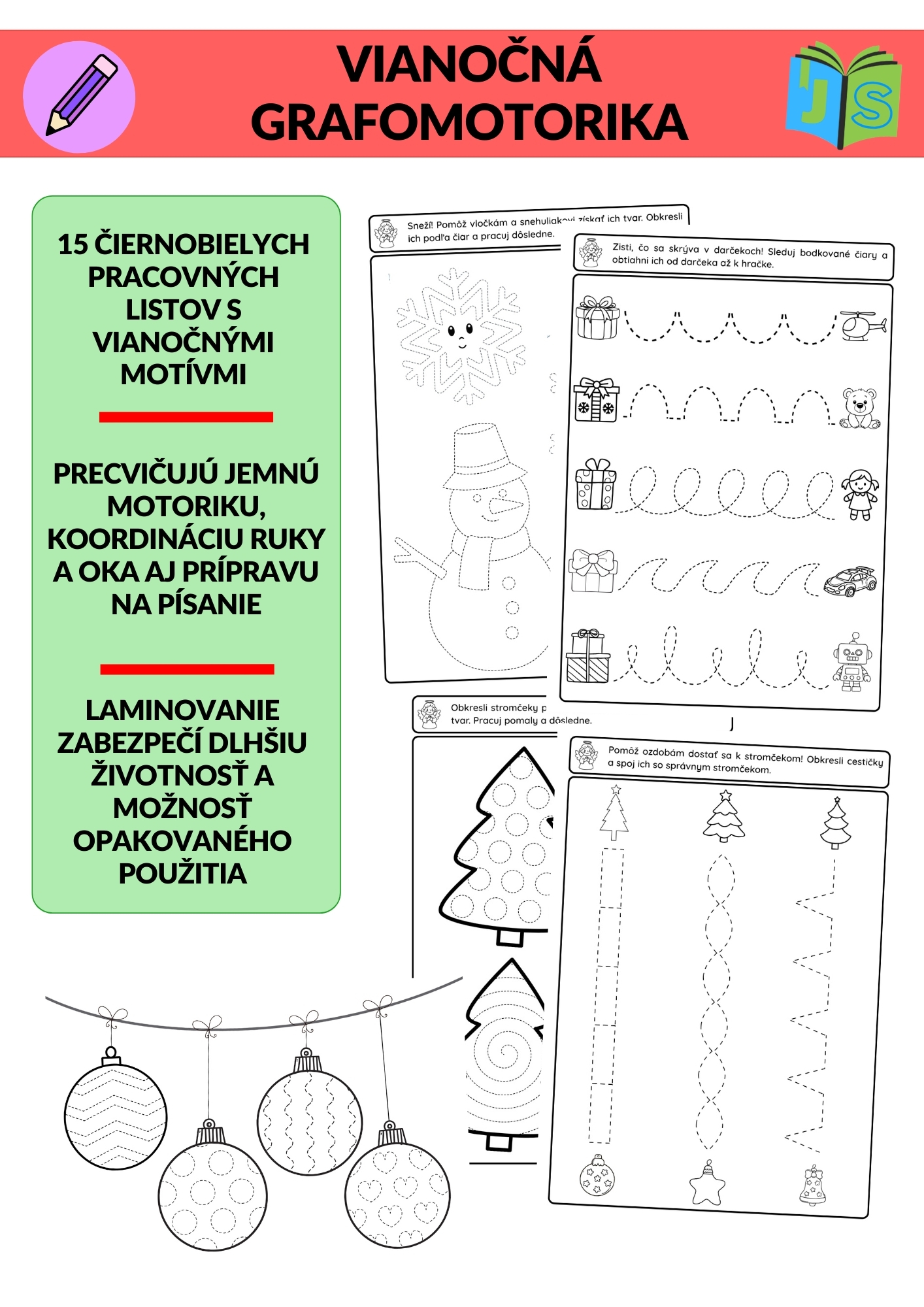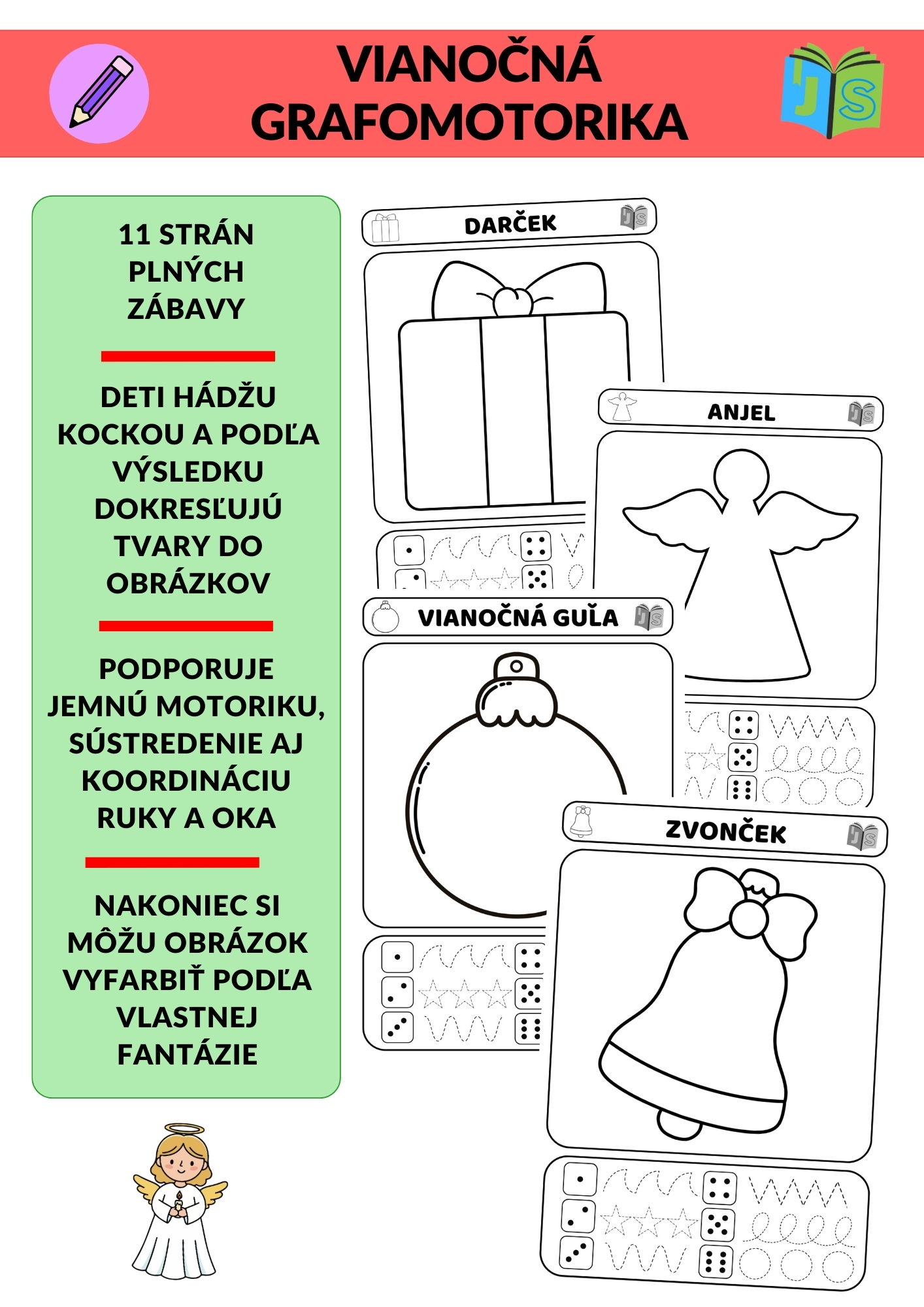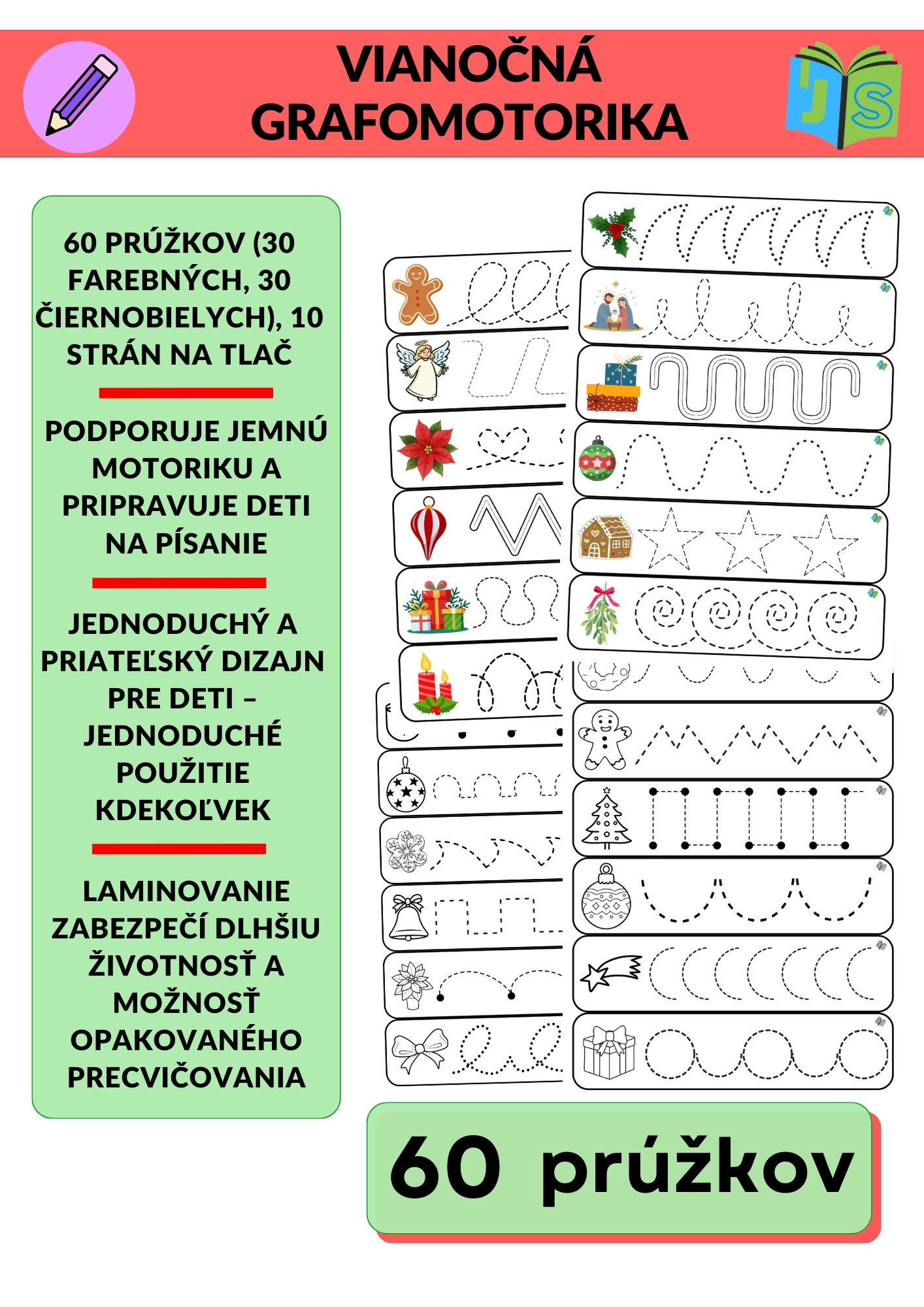 Vianočná grafomotorika je súbor 36 strán aktivít, ktoré pomáhajú deťom rozvíjať jemnú motoriku, koordináciu ruky a oka, vizuálne vnímanie aj predpísacie zručnosti. Materiál obsahuje spolu 60 grafomotorických prúžkov (30 farebných, 30 čiernobielych), 11 hravých listov s kockou a 15 pracovných listov zameraných na obtahovanie, spájanie a dokončovanie tvarov.