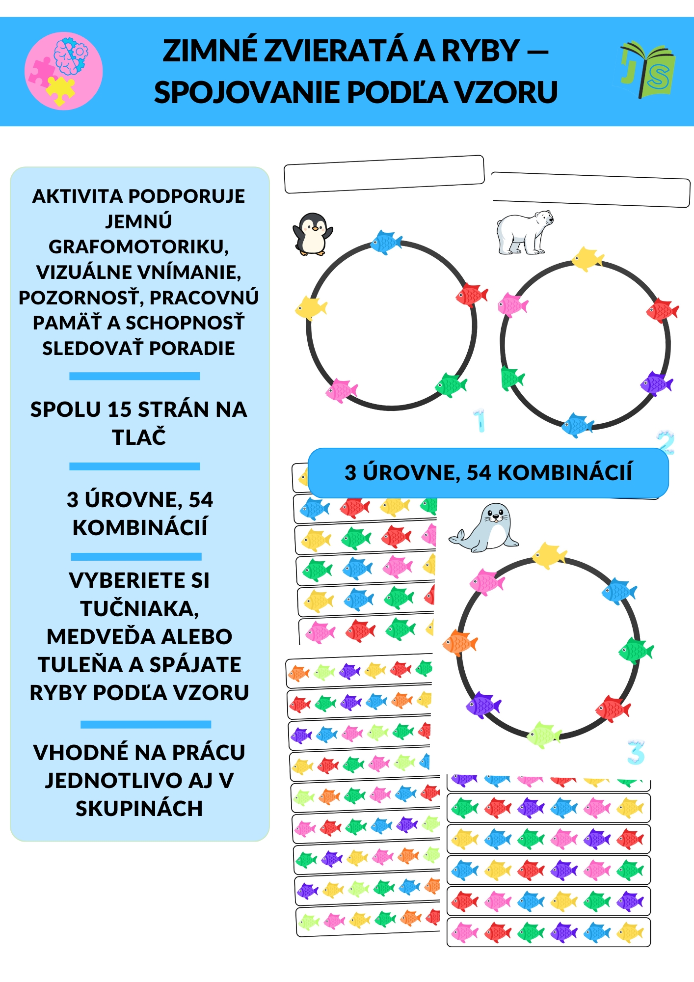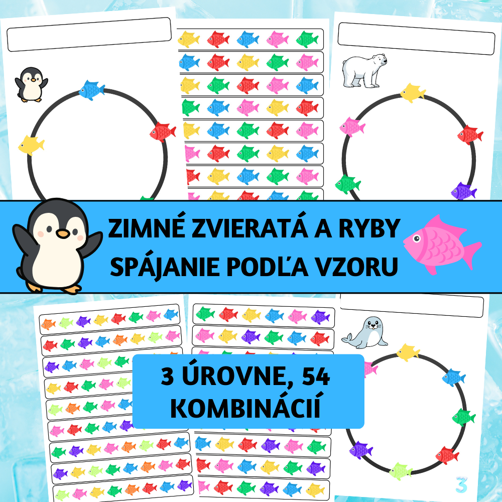 Zimné zvieratá a ryby je vizuálno-motorická aktivita zameraná na spájanie rybiek podľa farebného vzoru. Deti sledujú farebnú postupnosť na prúžku a spájajú rybky na kruhu pri vybranom zimnom zvierati. Materiál rozvíja vizuálnu percepciu, pracovnú pamäť, schopnosť sledovať poradie, pozornosť a jemnú grafomotoriku.