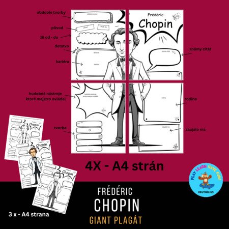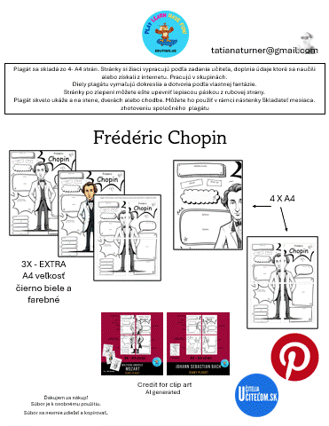 Plagát sa skladá zo 4- A4 strán. Stránky si žiaci vypracujú podľa zadania učiteľa, doplnia údaje ktoré sa naučili alebo získali z internetu. Pracujú v skupinách. Diely plagátu vymaľujú dokreslia a dotvoria podľa vlastnej fantázie. Stránky po zlepení môžete ešte upevniť lepiacou páskou z rubovej strany. Plagát skvelo ukáže a na stene, dverách alebo chodbe. Môžete ho použiť v rámci nástenky Skladateľ mesiaca.