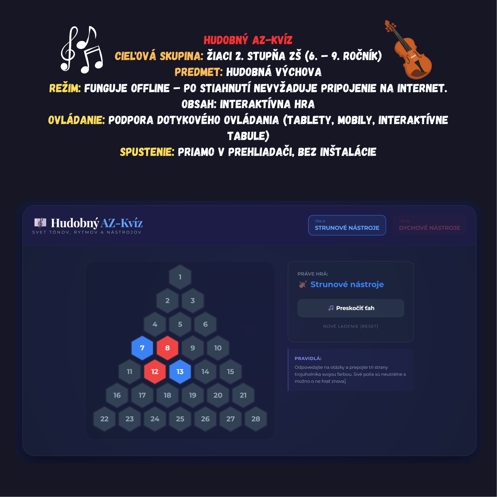 Tento digitálny výučbový materiál predstavuje moderné poňatie obľúbenej vedomostnej súťaže, adaptované pre potreby hudobnej výchovy na 2. stupni ZŠ a stredných školách. Hra kombinuje súťaživosť s odbornými znalosťami v profesionálnom grafickom spracovaní.