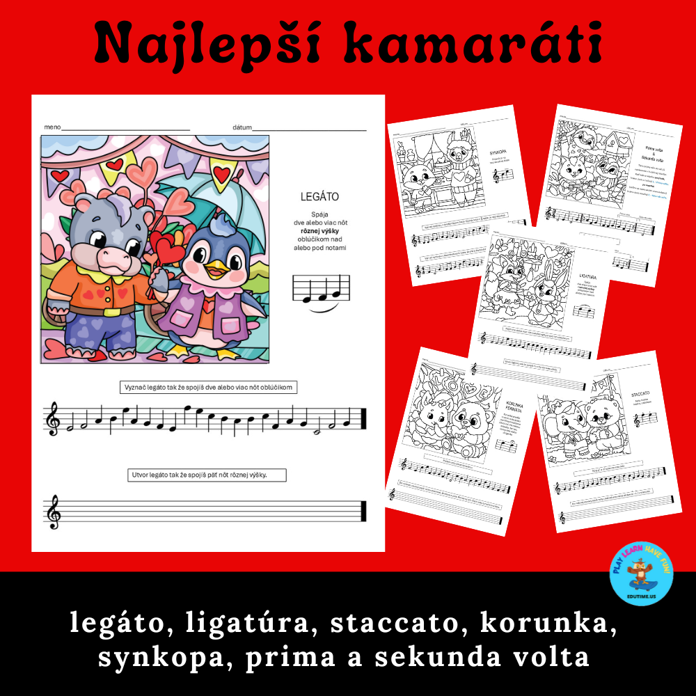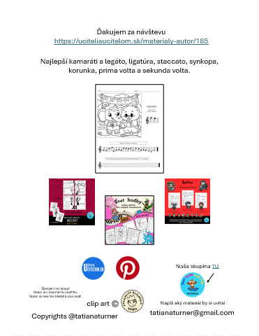 Pracovné listy na upevnenie si legáta, ligatúry, staccata, korunky, synkopy , prima a sekunda volta spoločne s najlepšími kamarátmi. Pre najmenších.