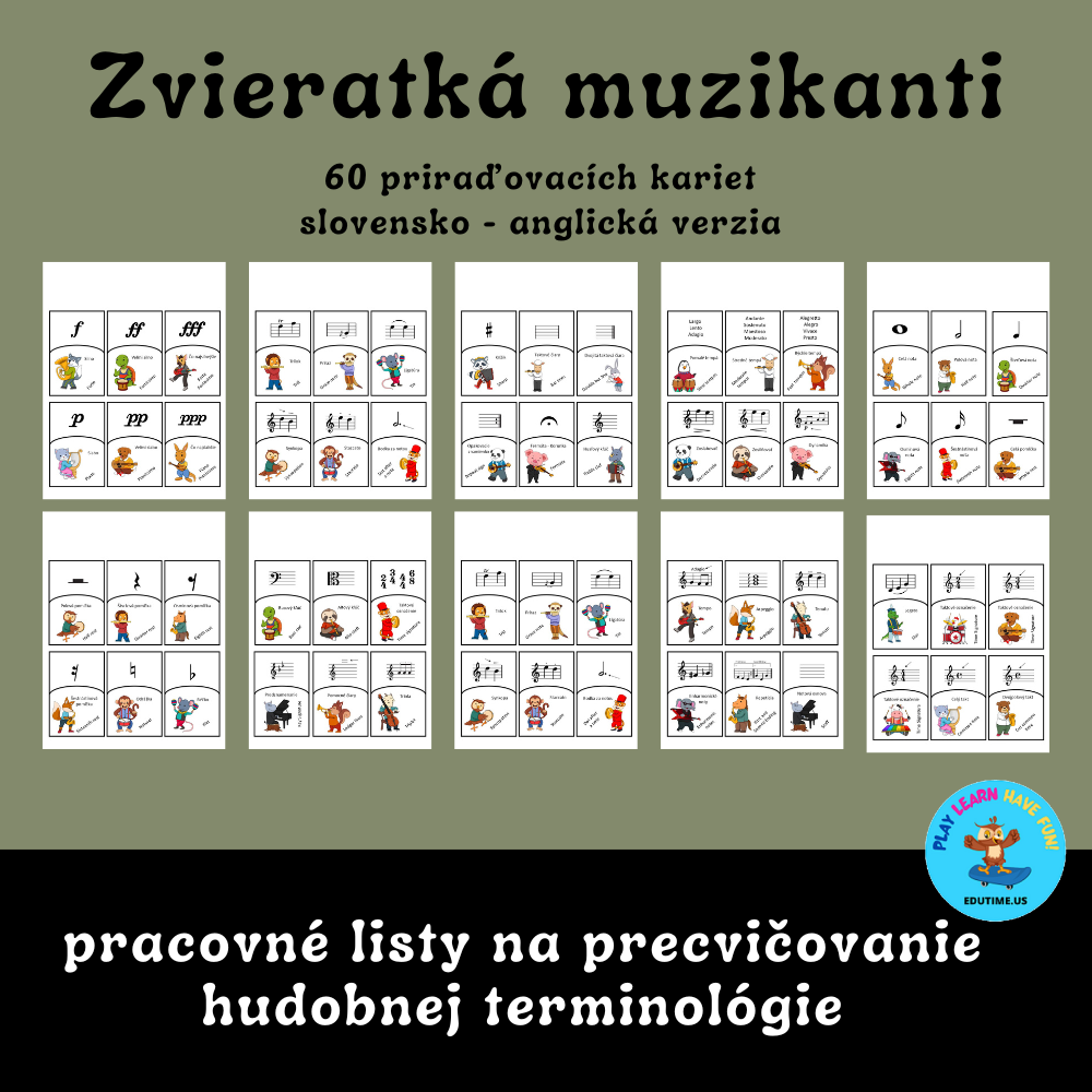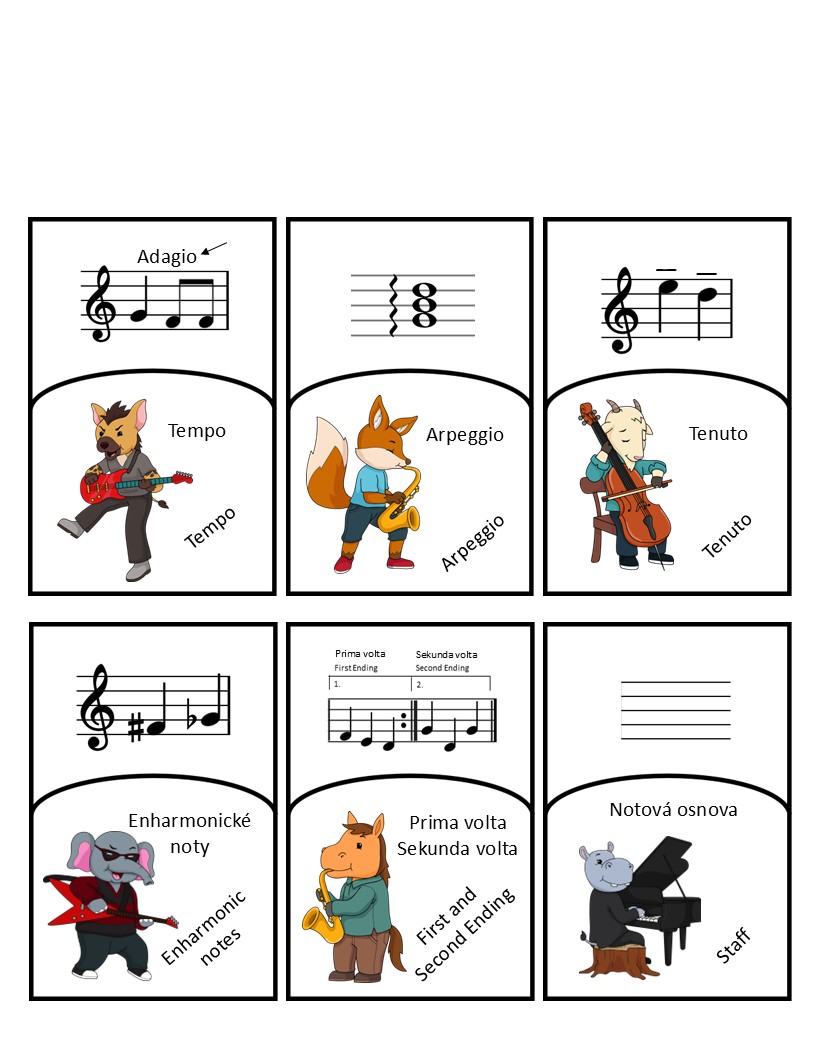 Spolu so zvieratkami muzikantmi si budeme precvičovať hudobnú terminológiu. Zahrnuté sú noty, pomlčky, posuvky, hudobné kľúče, notová osnova, pomocné čiary, korunka, tempové označenia, dynamické znamienka, taktové , predznamenania, ligatúra, legáto, staccato, synkopa, bodka za notou, dvojitá taktová čiara, opakovacie znamienko, taktové označenia, triola, celý takt, dvojpolový takt, trilok, príraz, synkopa, arpeggio, tenuto, enharmonické noty, prima a sekunda volta.