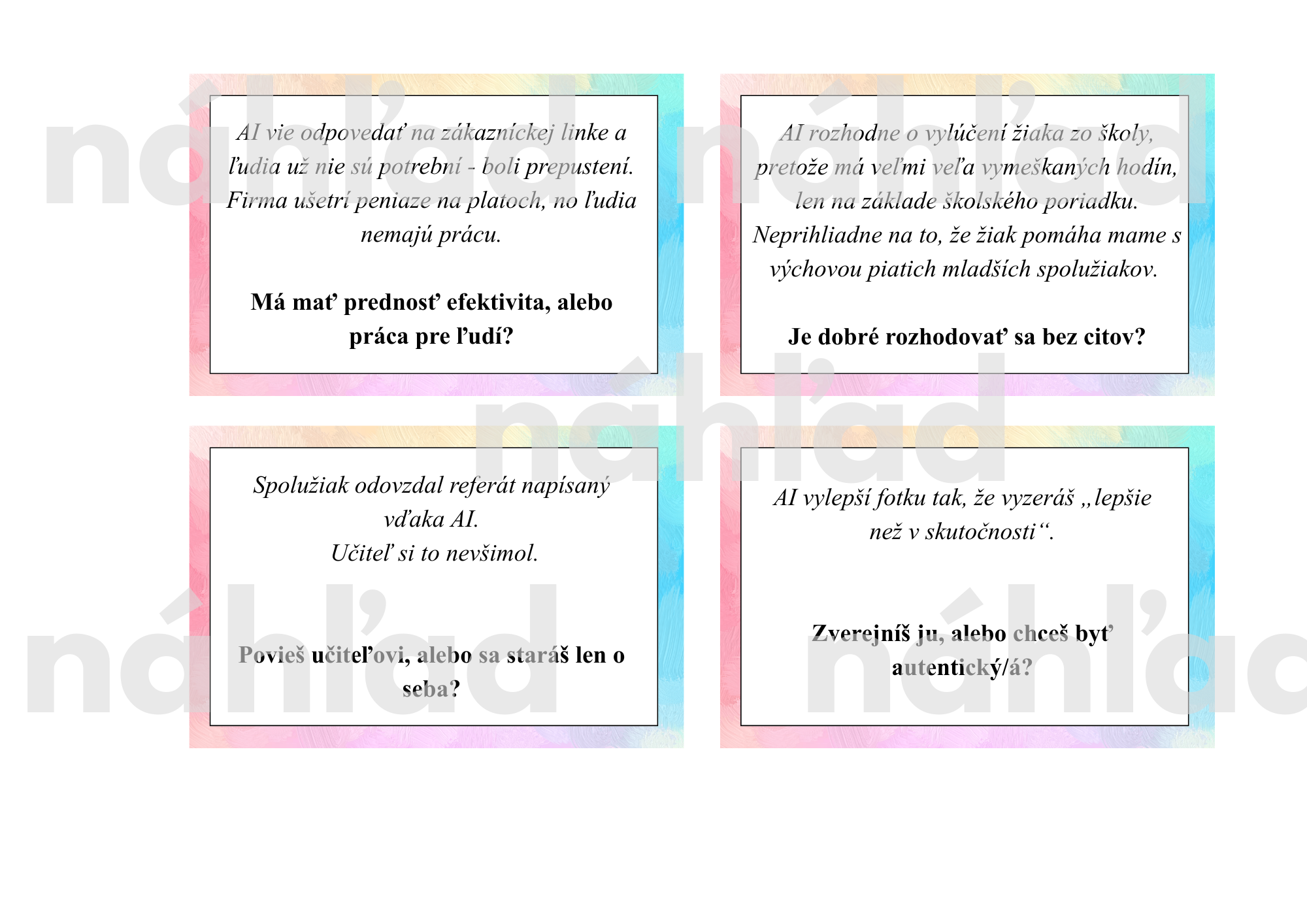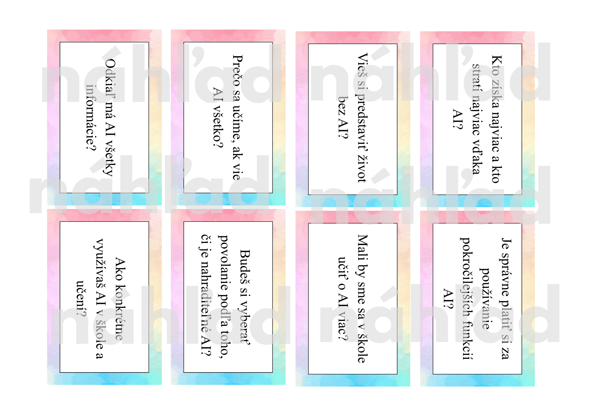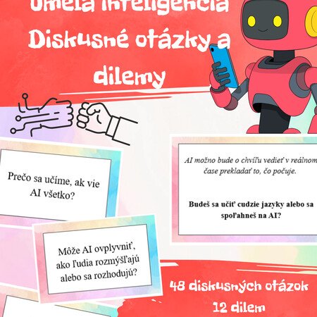 Materiál obsahuje 48 kariet s otázkami a 12 kariet s dilemou o umelej inteligencii. Je vhodný pre žiakov na 2. stupni ZŠ. Kartičky odporúčam vytlačiť farebne a zalaminovať. Aktivitu môžete realizovať rôznymi spôsobmi, mne sa osvedčila spoločná diskusia v kruhu. Zvyčajne sa k otázke chcú vyjadriť viacerí žiaci a učiteľ má potom možnosť moderovať to.