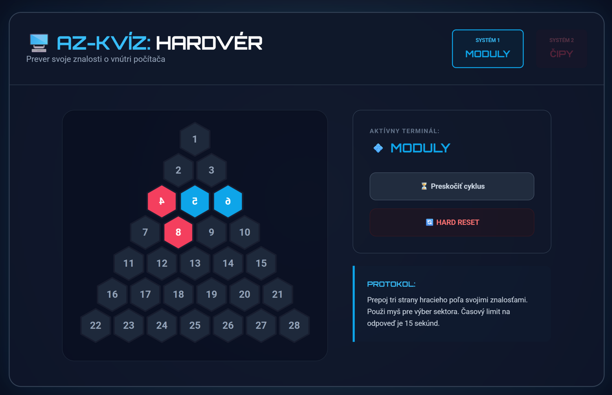 Premeňte hodinu informatiky na napínavú súťaž! Tento digitálny AZ-kvíz je perfektným nástrojom na opakovanie hardvéru a vnútorných častí počítača. Žiaci súperia v dvoch tímoch (Moduly vs. Čipy) a snažia sa strategicky prepojiť strany trojuholníkového poľa správnymi odpoveďami.