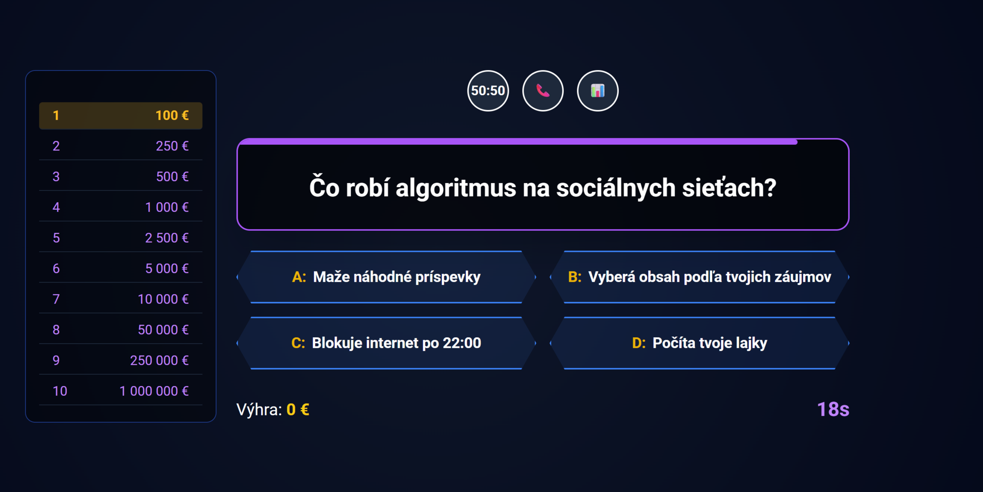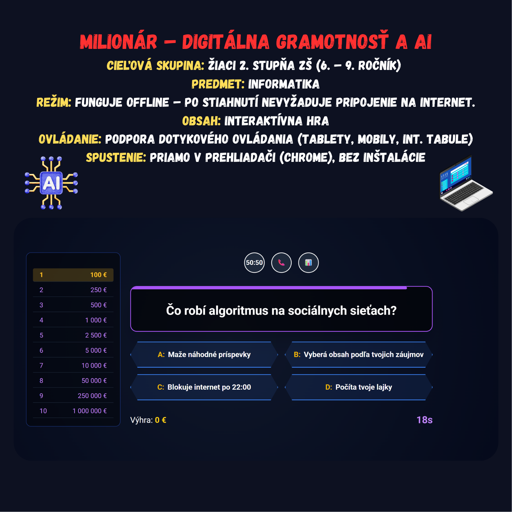 Premeňte hodinu informatiky na napínavý súboj vedomostí! Táto digitálna hra prenáša obľúbený formát televíznej súťaže priamo do vašej triedy. Žiaci sa hravou formou ponoria do detailov digitálneho sveta, od kybernetickej bezpečnosti až po fascinujúci svet umelej inteligencie.