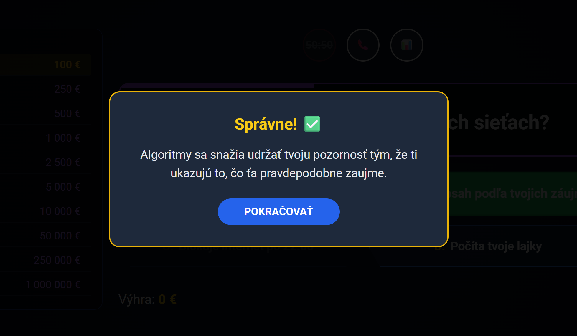 - Vizuálna spätná väzba: Po každej odpovedi sa zobrazí správne riešenie spolu s vysvetľujúcim faktom, čo zabezpečuje vzdelávací efekt aj pri chybnej voľbe.