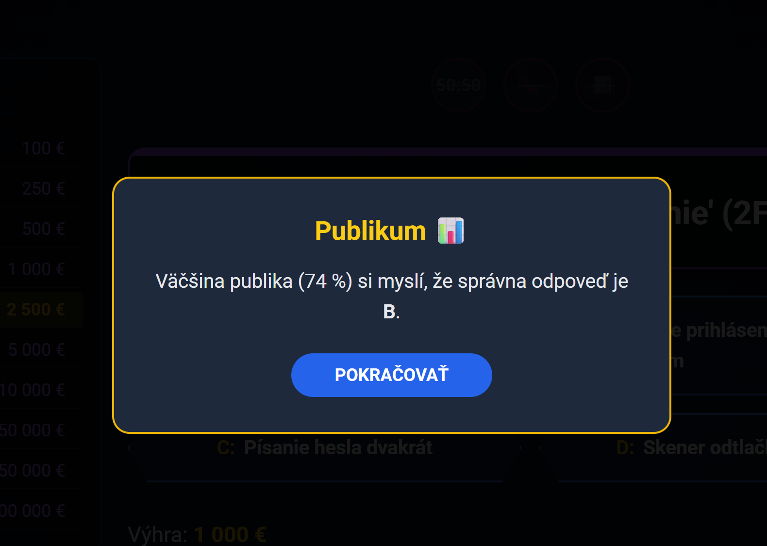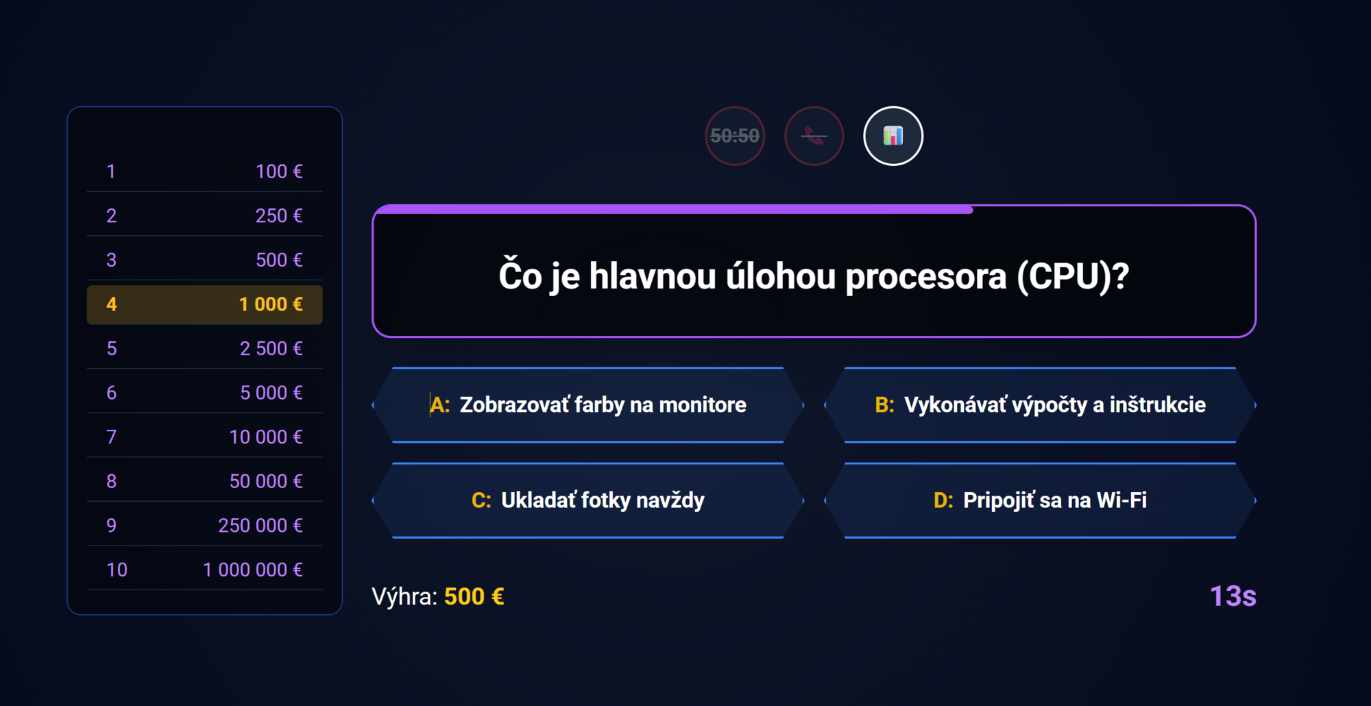 - Kompletná herná logika: Obsahuje tri typy nápovied (50:50, priateľ na telefóne, publikum), automatické pripisovanie výhier, časový limit na odpoveď a interaktívne zvukové efekty.