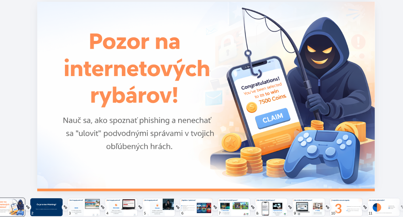 - Video vytvorené a nahovorené AI: Moderný prvok, ktorý okamžite zaujme pozornosť detí a vysvetlí phishing dynamickou formou.