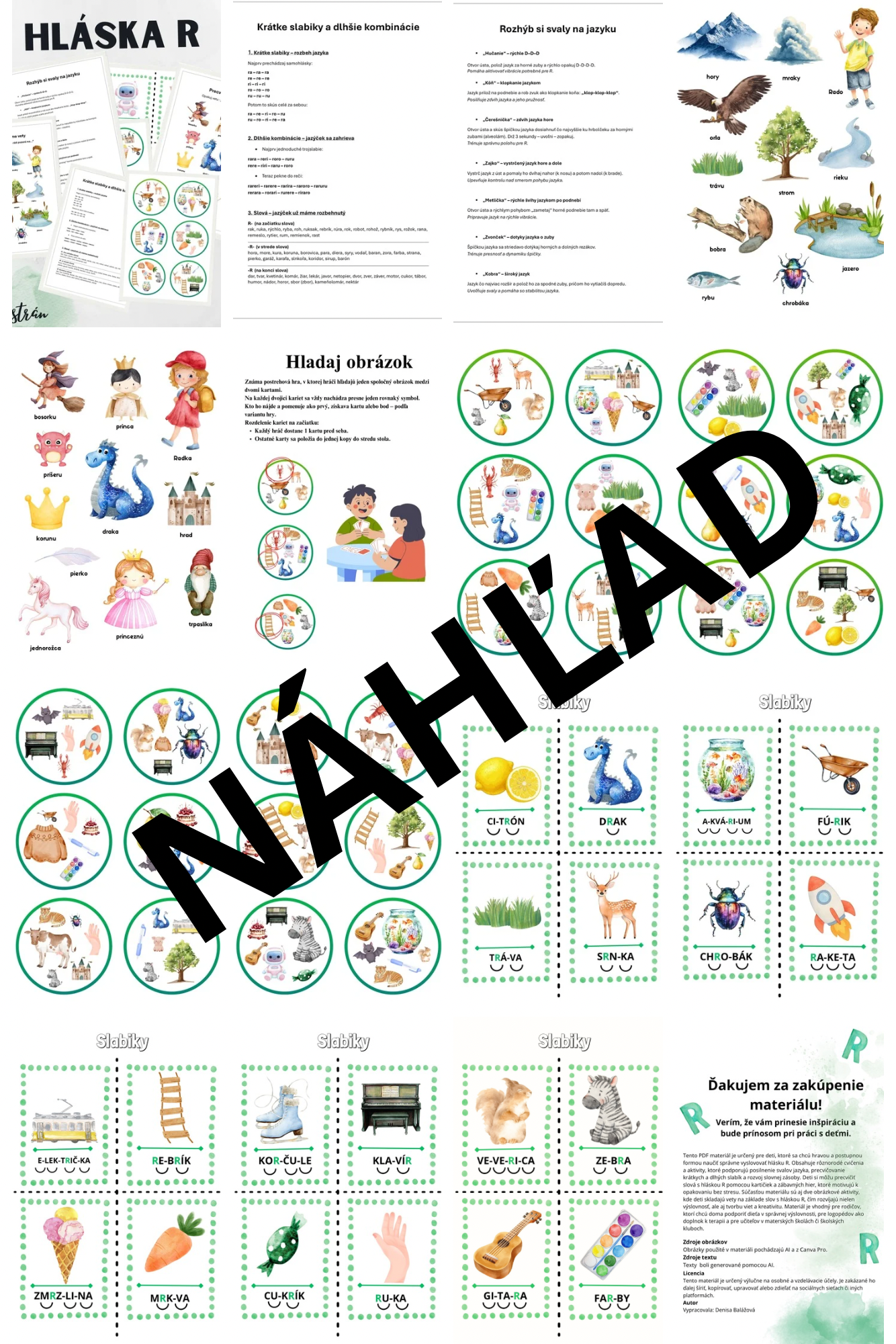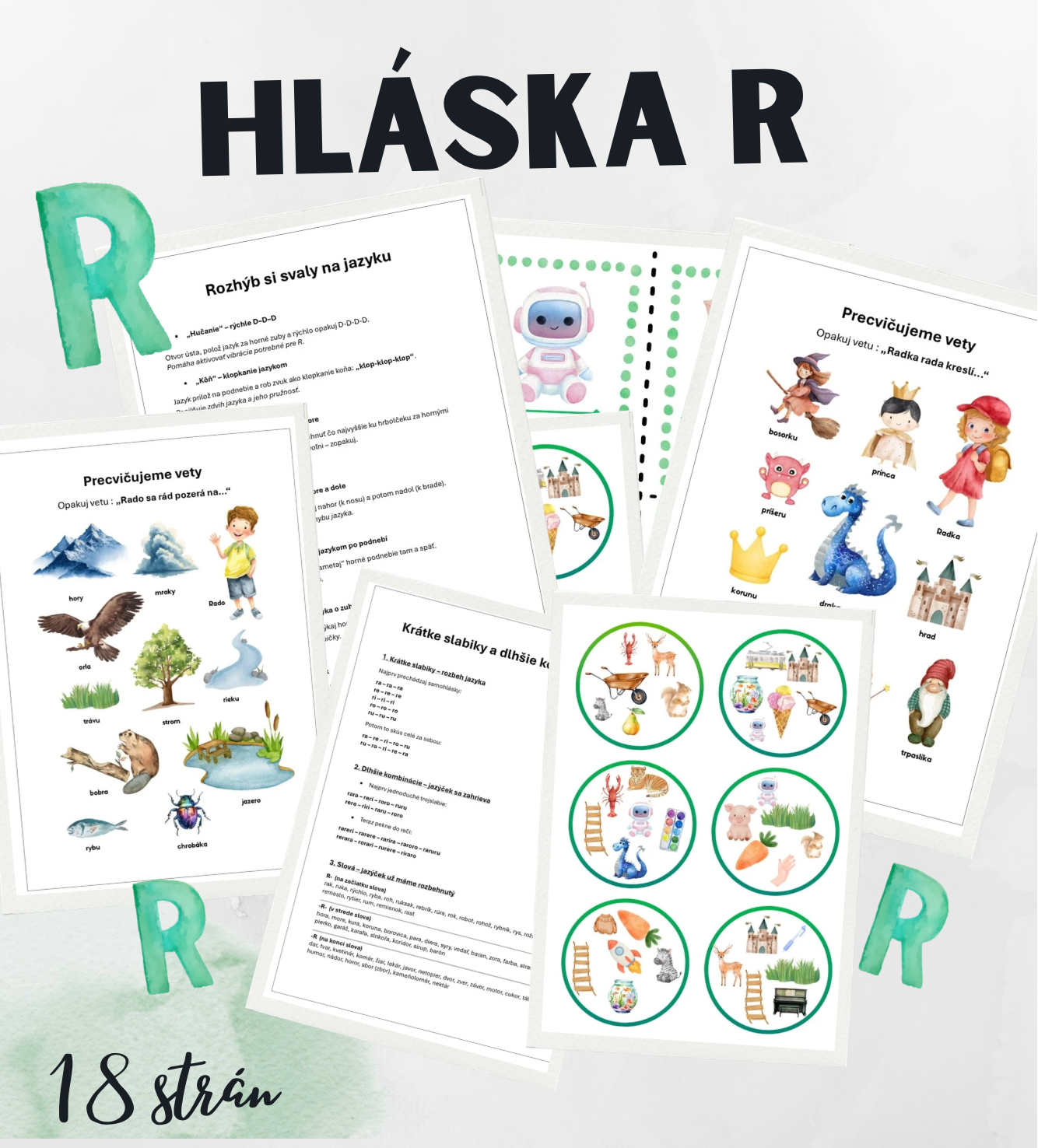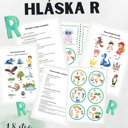 Tento PDF materiál je určený pre deti, ktoré sa chcú hravou a postupnou formou naučiť správne vyslovovať hlásku R. Obsahuje rôznorodé cvičenia a aktivity, ktoré podporujú posilnenie svalov jazyka, precvičovanie krátkych dlhých slabík a rozvoj slovnej zásoby. Deti si môžu precvičiť slová s hláskou R pomocou kartičiek a zábavných hier, ktoré motivujú k opakovaniu bez stresu. Súčasťou materiálu sú aj dve obrázkové aktivity, kde deti skladajú vety na základe slov s hláskou R, čím rozvíjajú nielen výslovnosť, ale aj tvorbu viet a kreativitu. Materiál je vhodný pre rodičov, ktorí chcú doma podporiť dieťa v správnej výslovnosti, pre logopédov ako doplnok k terapii a pre učiteľov v materských školách či školských kluboch.