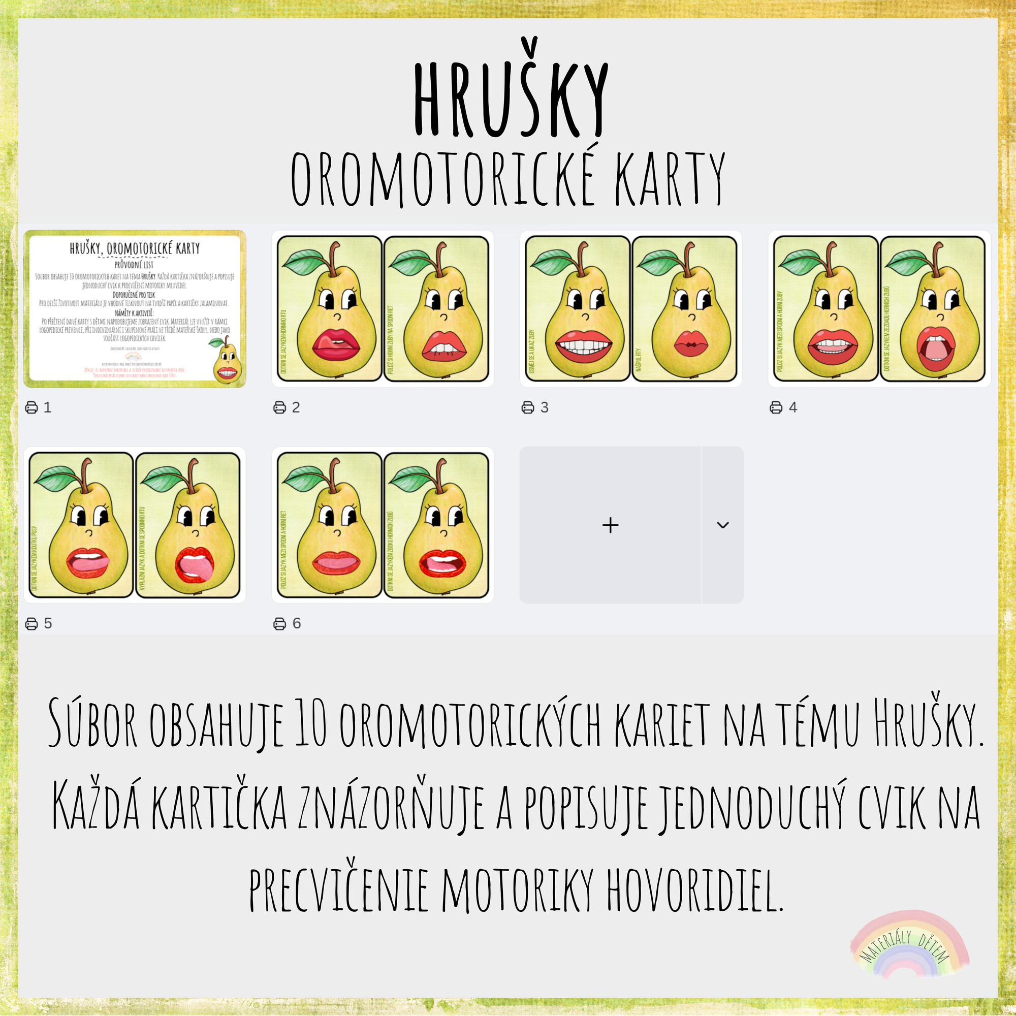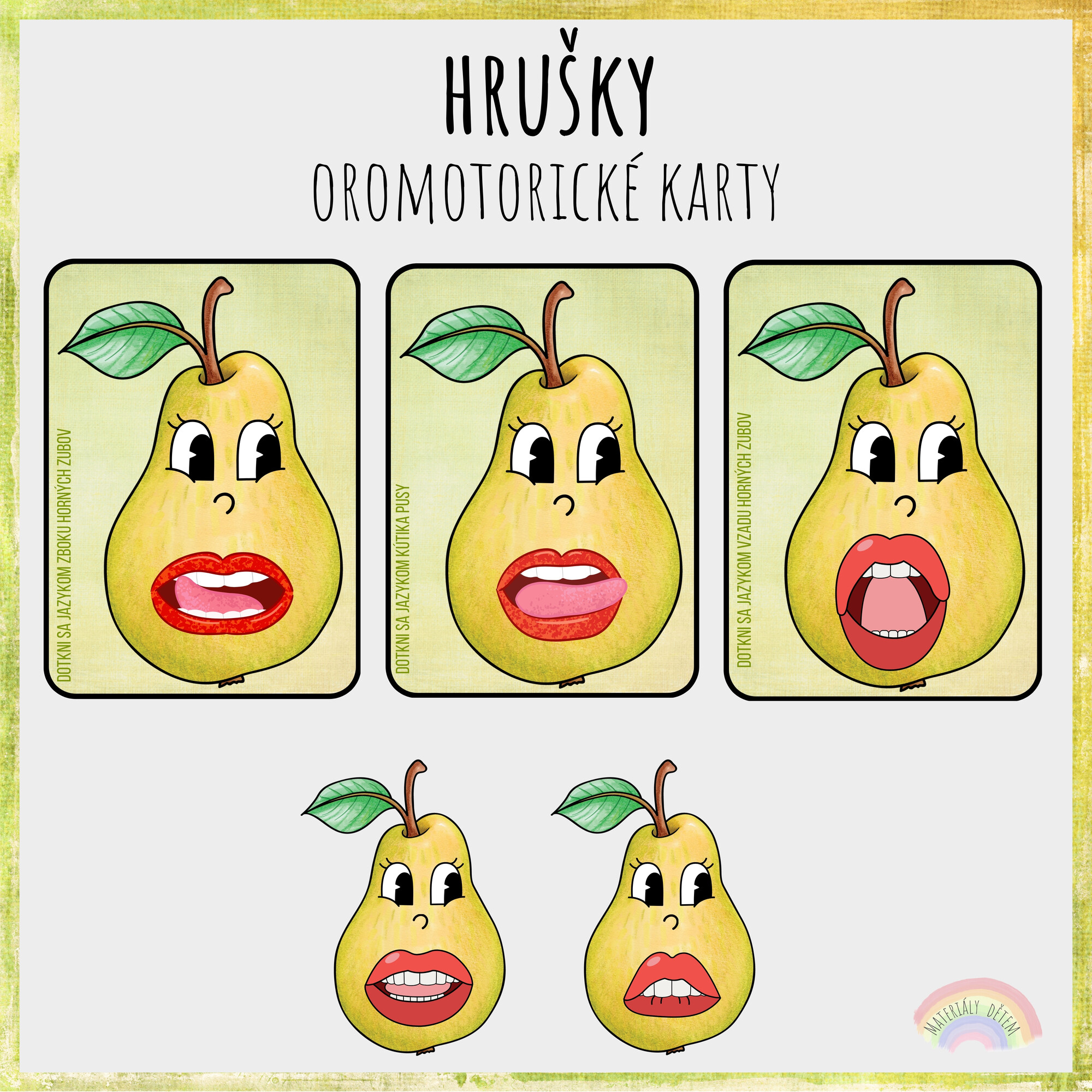 Súbor obsahuje 10 oromotorických kariet na tému Hrušky. Každá kartička znázorňuje a popisuje jednoduchý cvik na precvičenie motoriky hovoridiel.