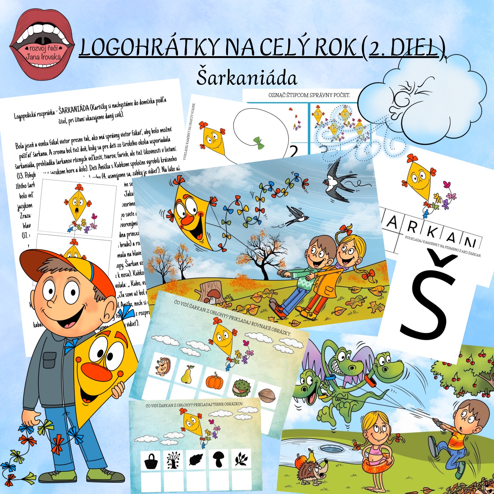 Súbor obsahuje príbeh ŠARKANIÁDA, oromotorické cviky, slabikovanie, ukladanie kamienkov na chvostík, dychové cvičenia, skladanie šarkana podľa veľkosti, skladanie slova ŠARKAN, štipcovanie, omaľovánky, skladačky.