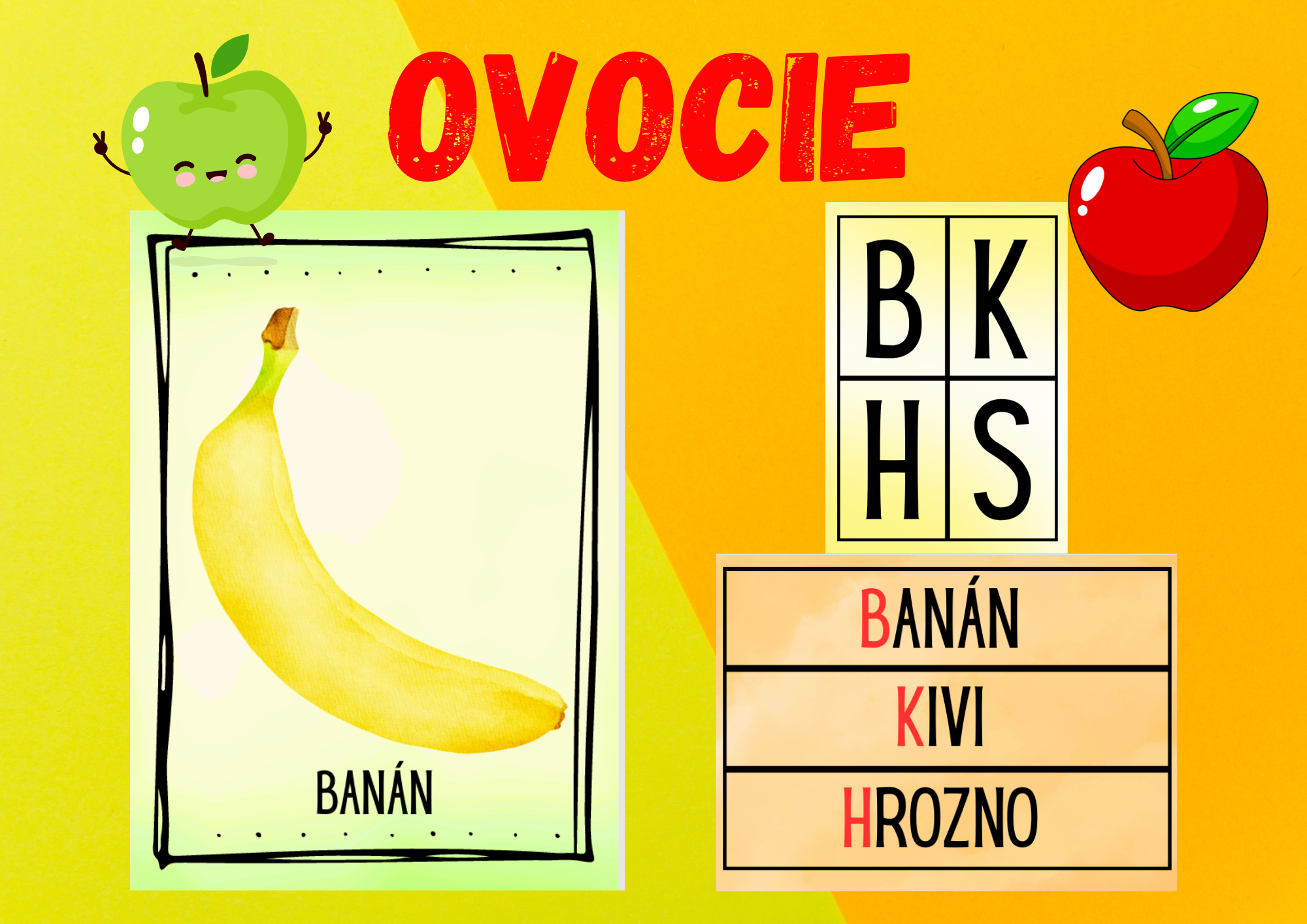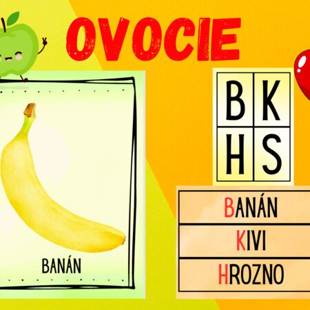 Materiál slúži na spoznávanie ovocia, na vyvodenie prvej hlásky, a aj na využitie v predčitateľskej gramotnosti.