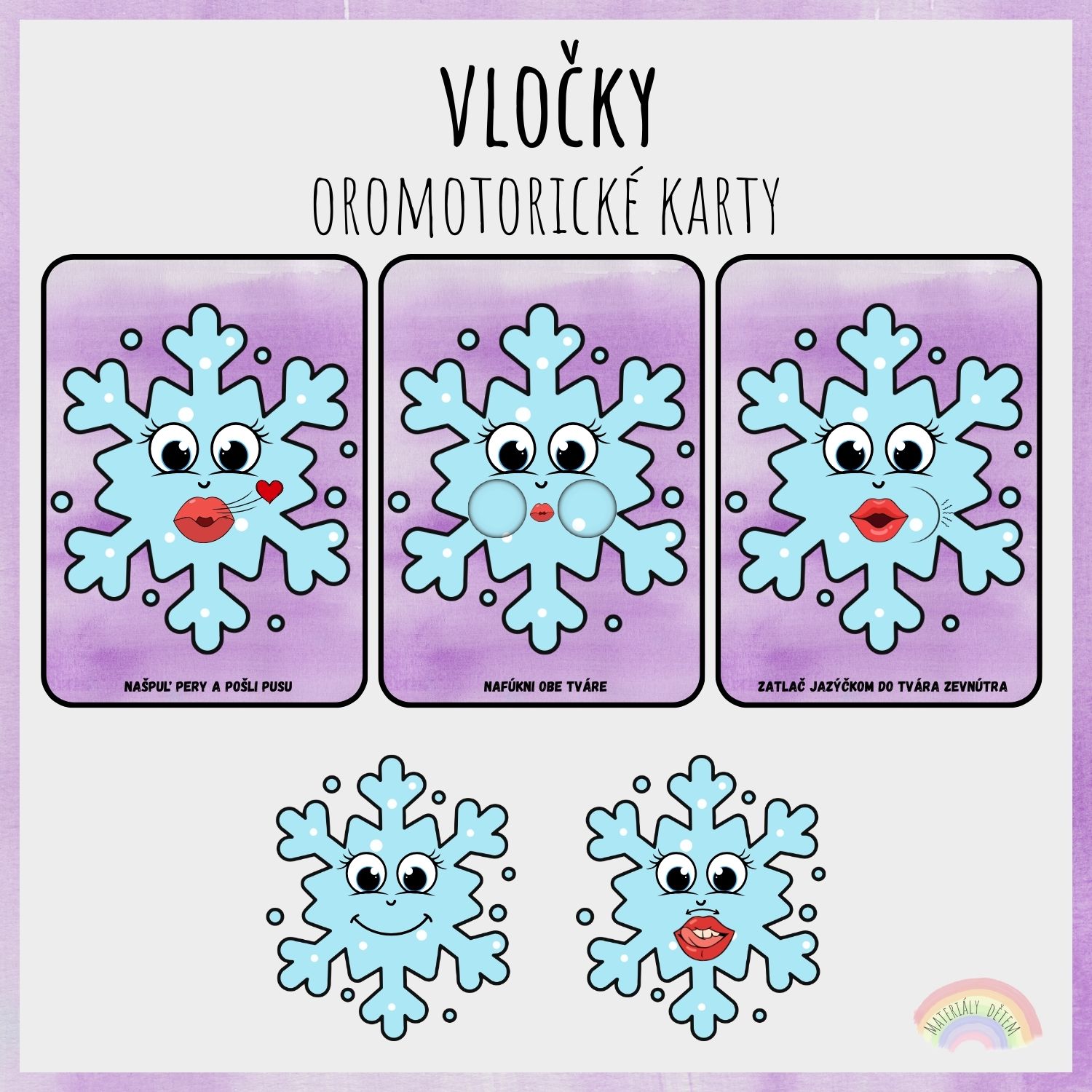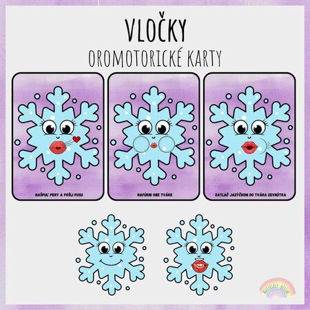 Súbor obsahuje 10 oromotorických kariet na tému Vločky. Každá kartička znázorňuje a popisuje jednoduchý cvik na precvičenie motoriky hovoridiel.