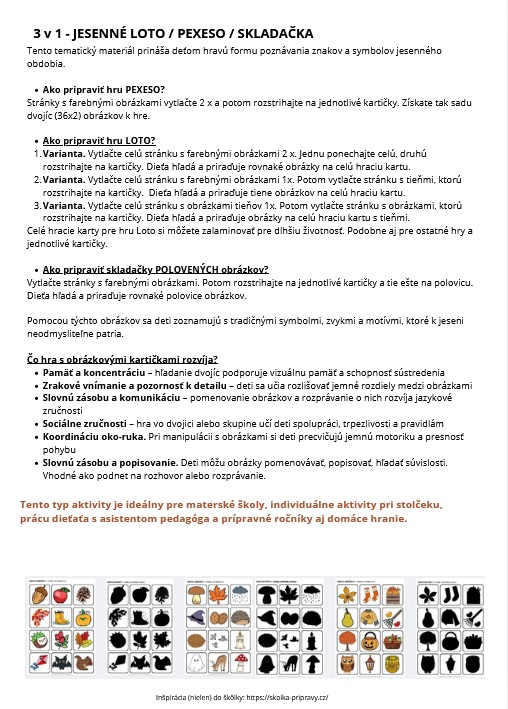 Tento tematický materiál prináša deťom hravú formu poznávania znakov a symbolov jesenného obdobia.