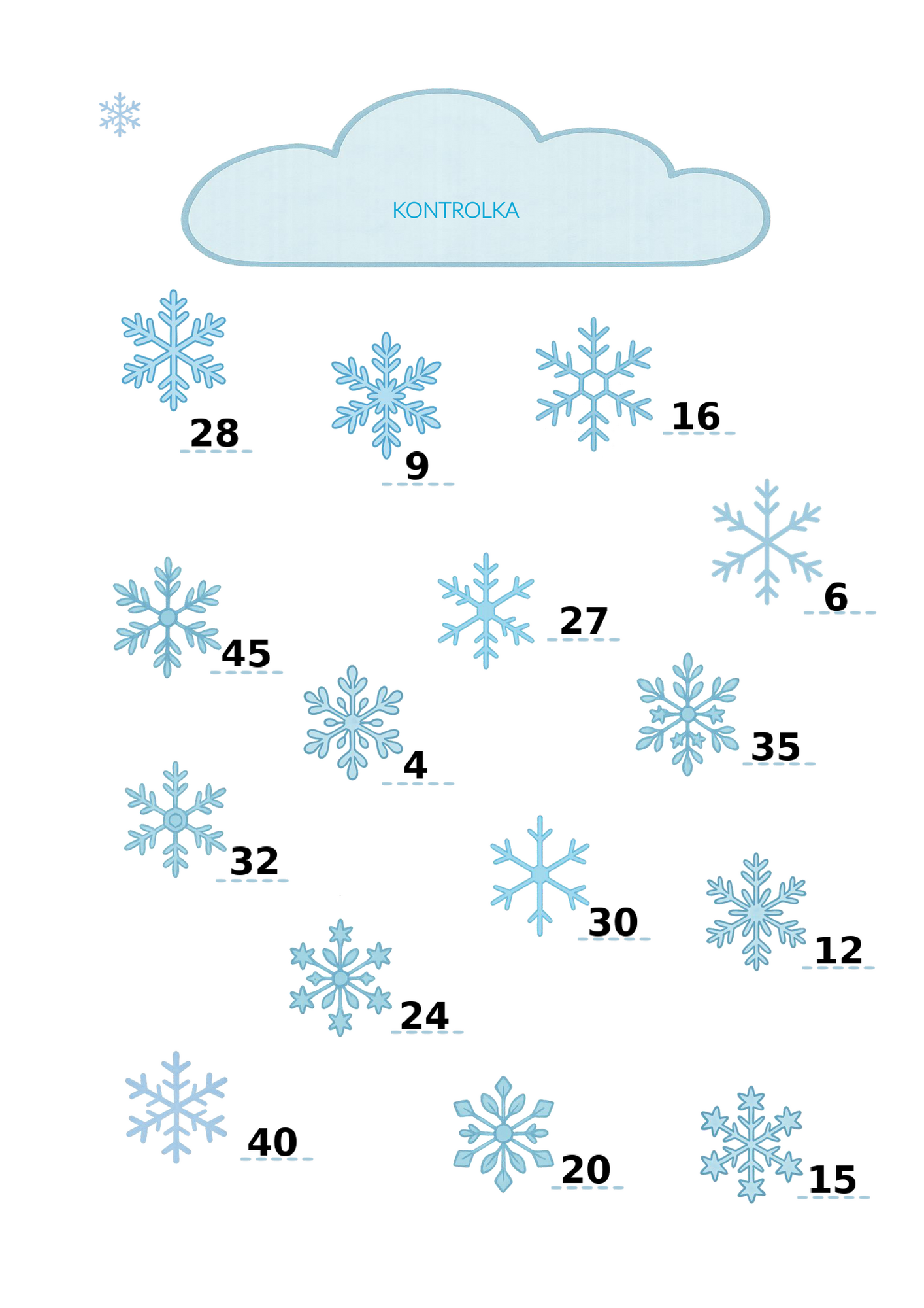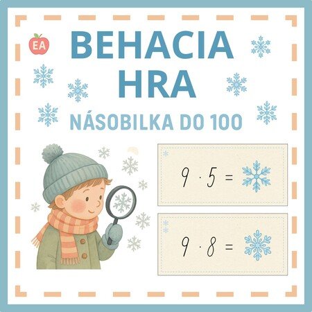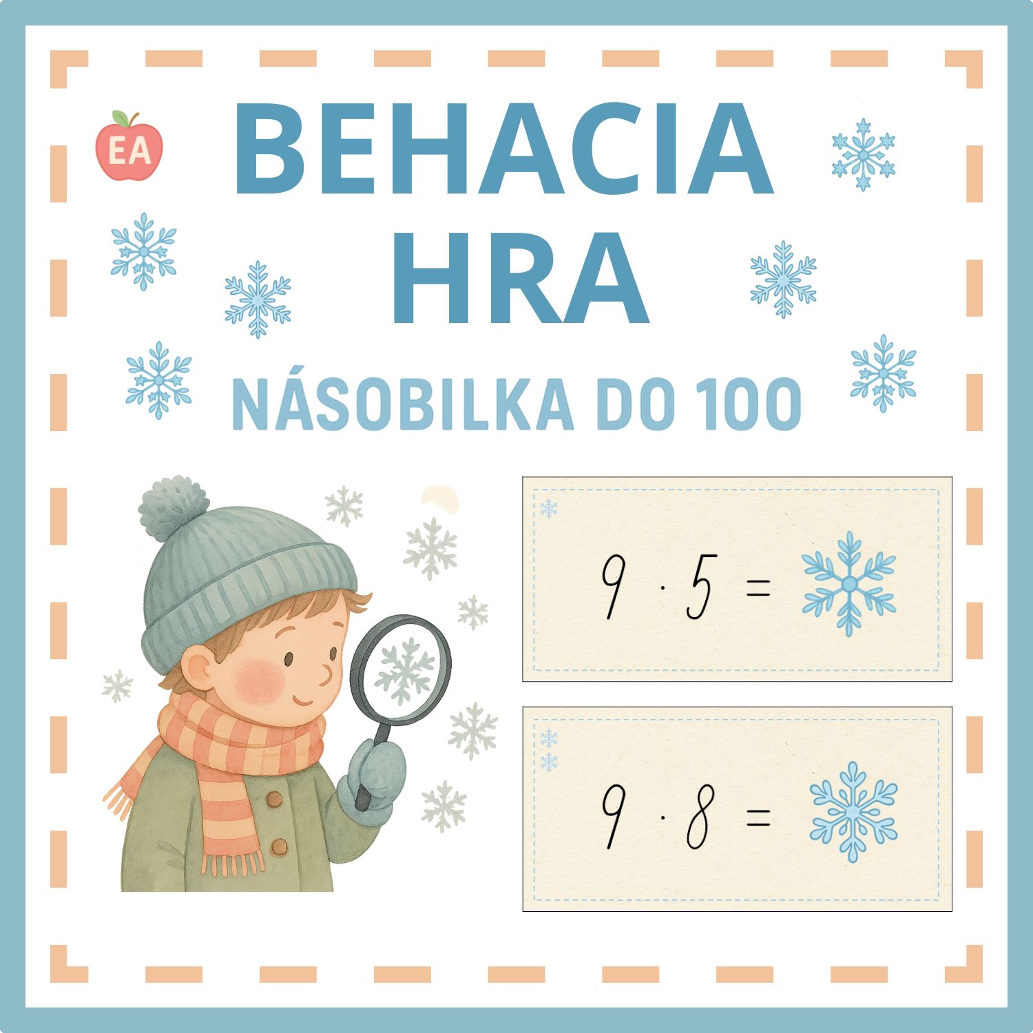 Aktívne zimné opakovanie násobenia do 100. Deti behajú, počítajú príklady a hľadajú správnu vločku. Dve obtiažnosti (1–5 / 6–10).