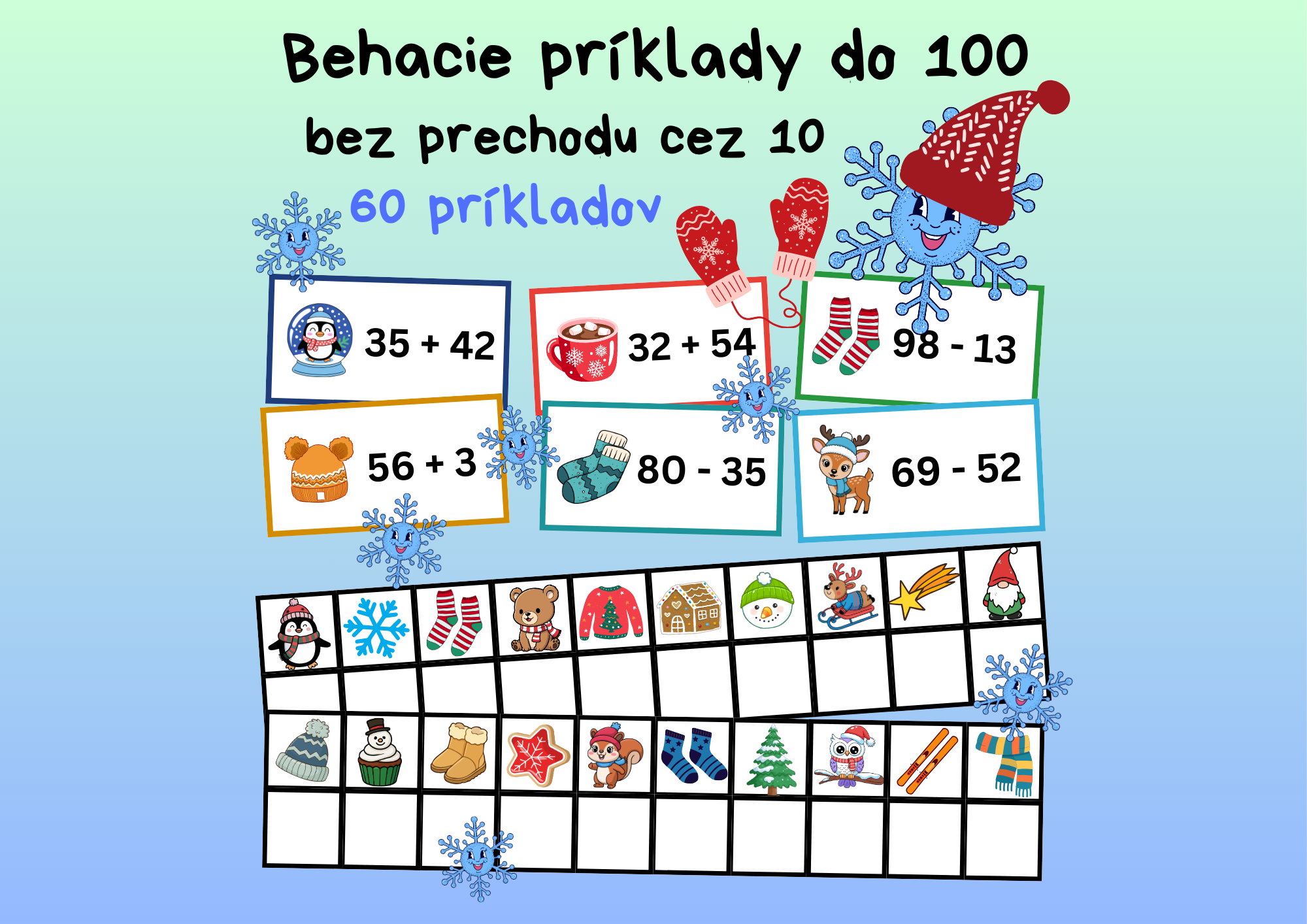❄️Ponúkam na predaj ďalší materiál zo série behacích príkladov v zimnom motíve: sčítanie a odčítanie do 100 bez prechodu cez 10.
