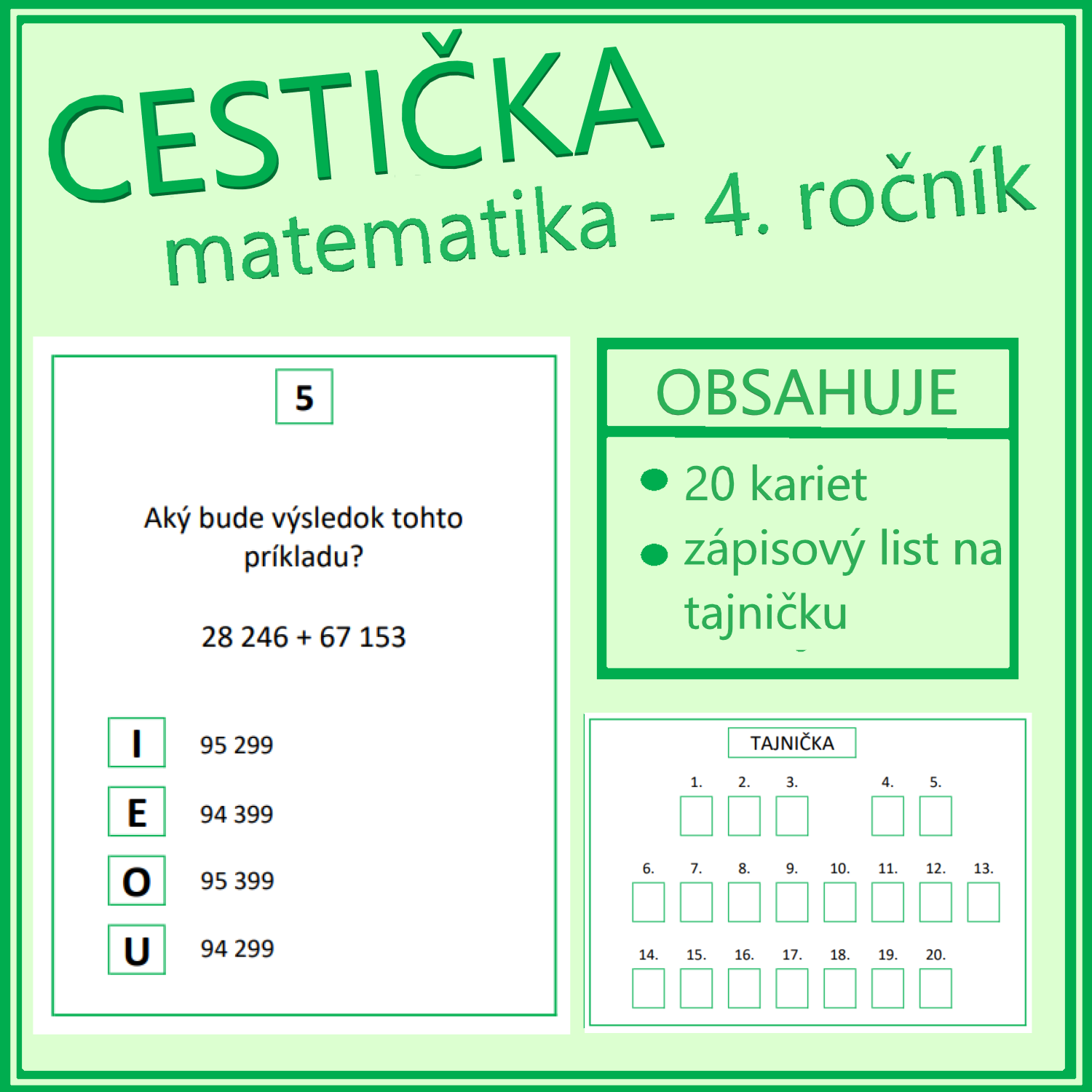 Vonkajšia, prípadne aj vnútorná hra zameraná na zopakovanie učiva matematiky na konci štvrtého ročníka. Na karte je príklad či úloha a 4 možnosti. Žiak vyberá jednu z možností a zapisuje do zápisného listu. Na konci mu z písmen vyjde tajenka. Materiál je nachystaný na 3 verzie tlače (karty vo veľkosti A4, A5 aj A6). Precvičuje aj porozumenie textu. Obsahuje témy: porovnávanie, zaokrúhľovanie, počítanie so zátvorkami, sčítanie a odčítanie do desaťtisíce, násobilka, prevody jednotiek času, dĺžky, hmotnosti, obsahu, delenie so zvyškom, vzájomná poloha priamok v rovine, trojuholníková nerovnosť, obvod a obsah štvorca a obdĺžnika.