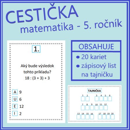 Vonkajšia, prípadne aj vnútorná hra zameraná na zopakovanie učiva matematiky na konci piateho ročníka. Na karte je príklad či úloha a 4 možnosti. Žiak vyberá jednu z možností a zapisuje do zápisného listu. Na konci mu z písmen vyjde tajenka. Materiál je nachystaný na 3 verzie tlače (karty vo veľkosti A4, A5 aj A6). Precvičuje aj porozumenie textu. Obsahuje témy: telesá, výpočet obsahu obdĺžnika a štvorca, povrch kocky, násobenie a delenie 10, 100, 1000…, zaokrúhľovanie, sčítanie a odčítanie do milióna, delenie so zvyškom, prevody jednotiek dĺžky, hmotnosti, obsahu, prednosti v počítaní, rímske číslice.