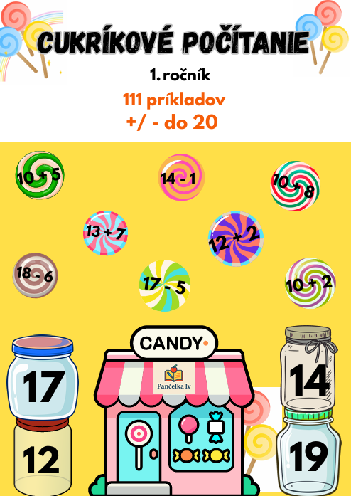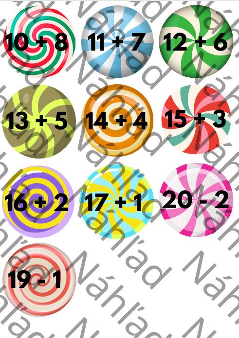 Materiál obsahuje dózičky s výsledkami od 10 do 20 a k nim 111 cukríkov s príkladmi na sčítanie a odčítanie.