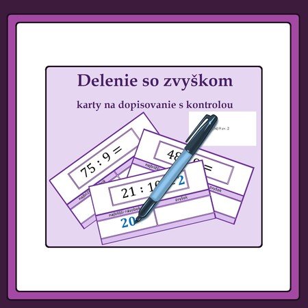 Na precvičovanie delenia so zvyškom. Na kartičke je miesto určené na zapísanie najbližšieho menšieho násobku deliteľa ako je delenec a miesto na zvyšok. Po otočení kartičky je možné svoje výsledky skontrolovať.