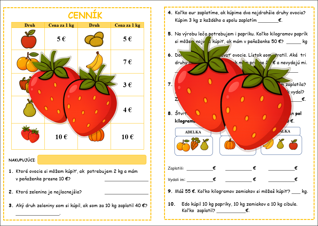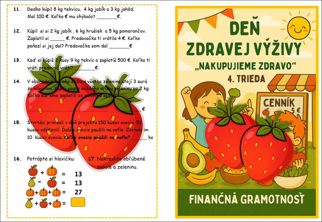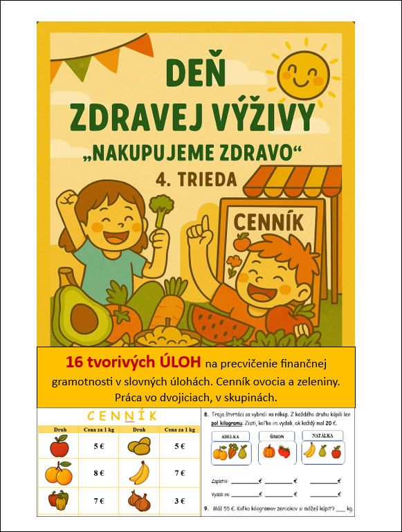 Knižočka DEŇ ZDRAVEJ VÝŽIVY s podnadpisom „Nakupujeme zdravo“, je materiál na hodinu MAT v 4. ročníku. Vytlačte obojstranne, zložte na polovicu a vznikne knižka. Za pár minút máte tematickú činnosť, ktorú môžu žiaci riešiť vo dvojiciach, skupinách. Ovocie a zelenina sú nielen vizuálne príťažlivé ale i známe deťom. Vďaka tomu sa ľahko orientujú v úlohách a zároveň si uvedomujú hodnotu potravín, ktoré denne konzumujú. Úlohy sú rôznorodé – od jednoduchých výpočtov až po logické.