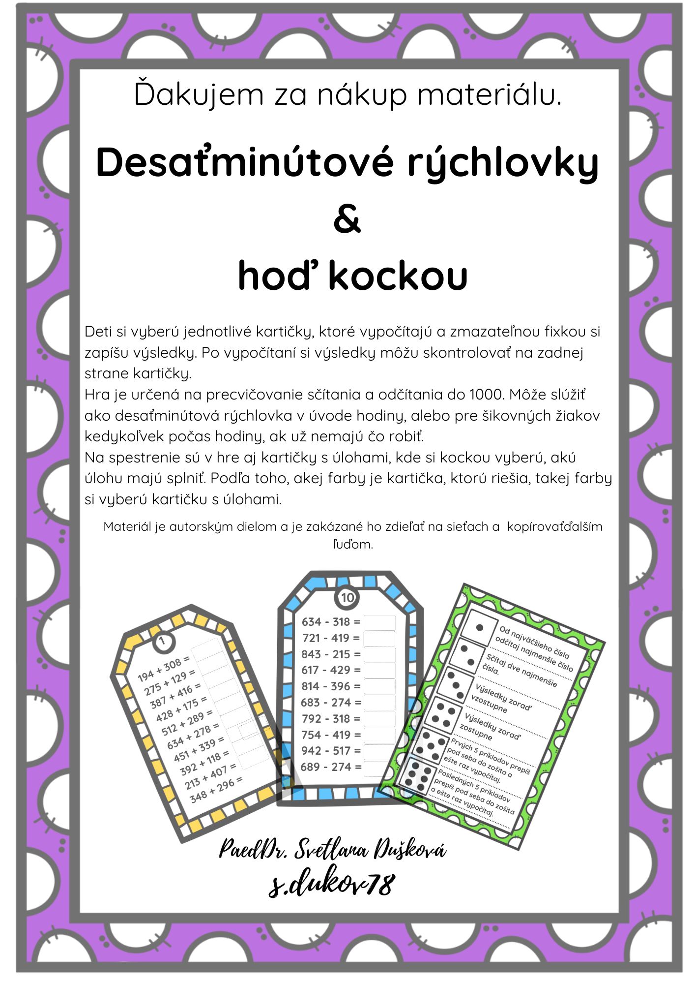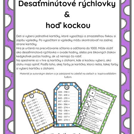 Hra je určená na precvičovanie sčítania a odčítania do 1000. Môže slúžiť ako desaťminútová rýchlovka v úvode hodiny, alebo pre šikovných žiakov kedykoľvek počas hodiny.