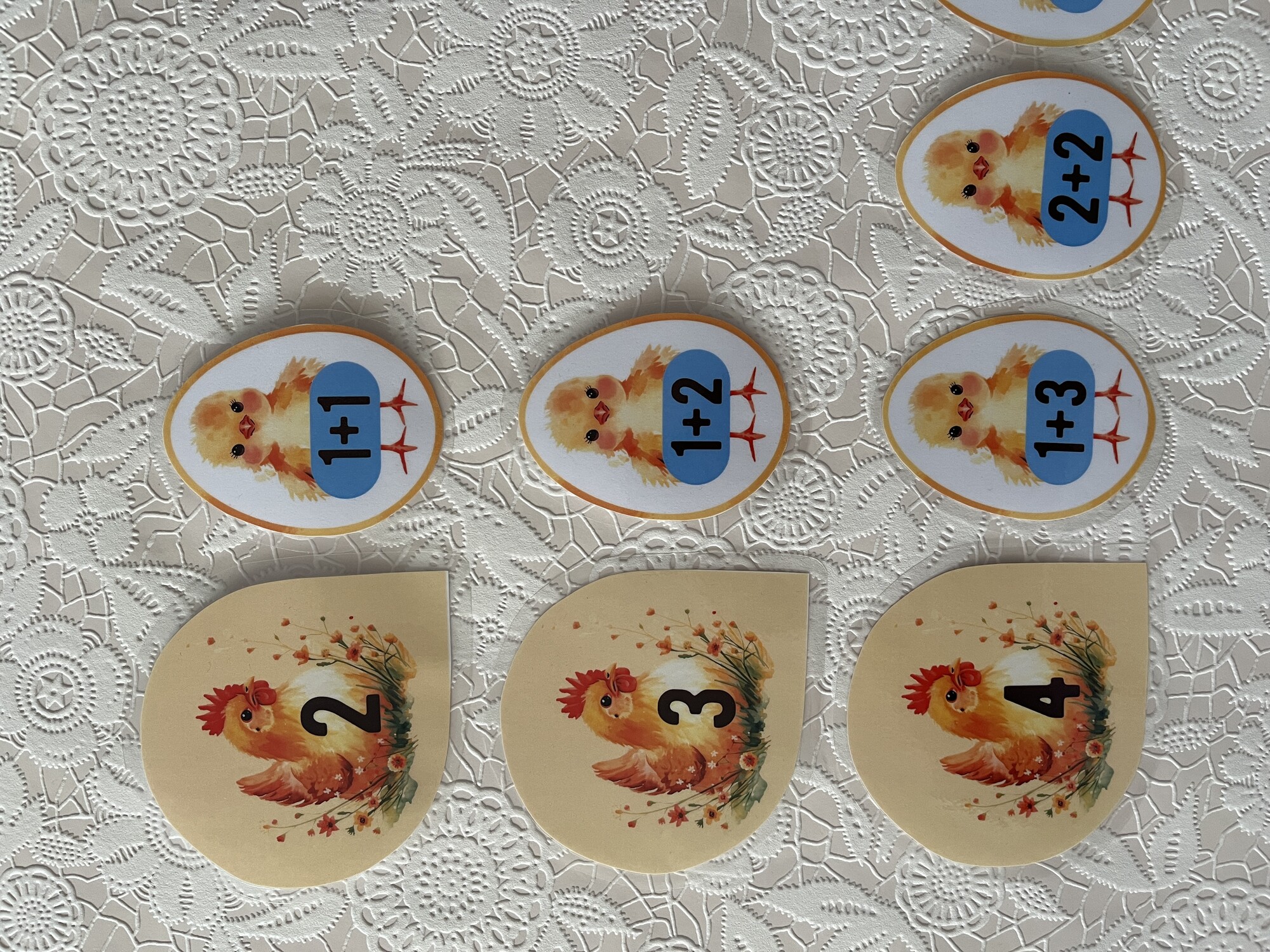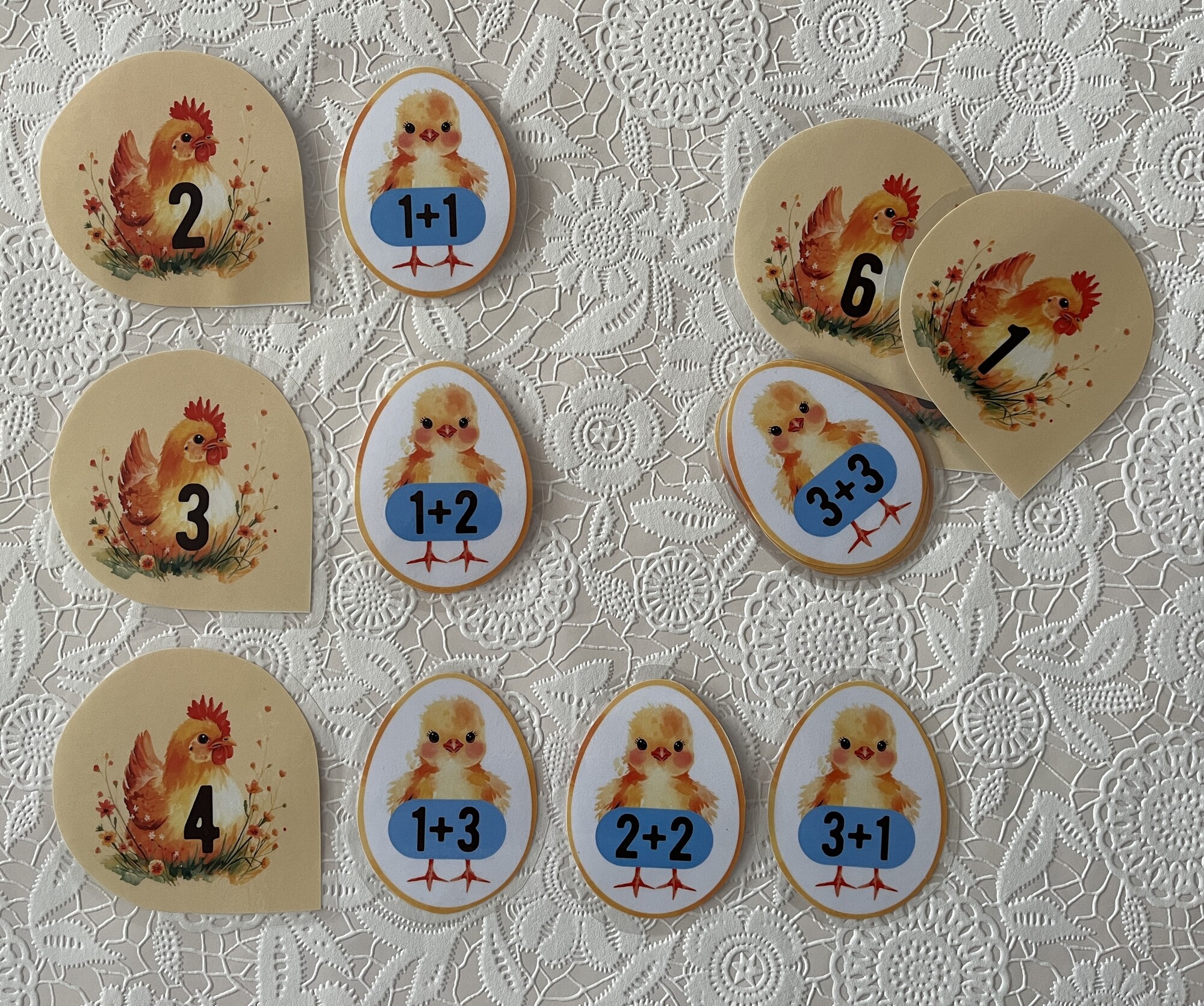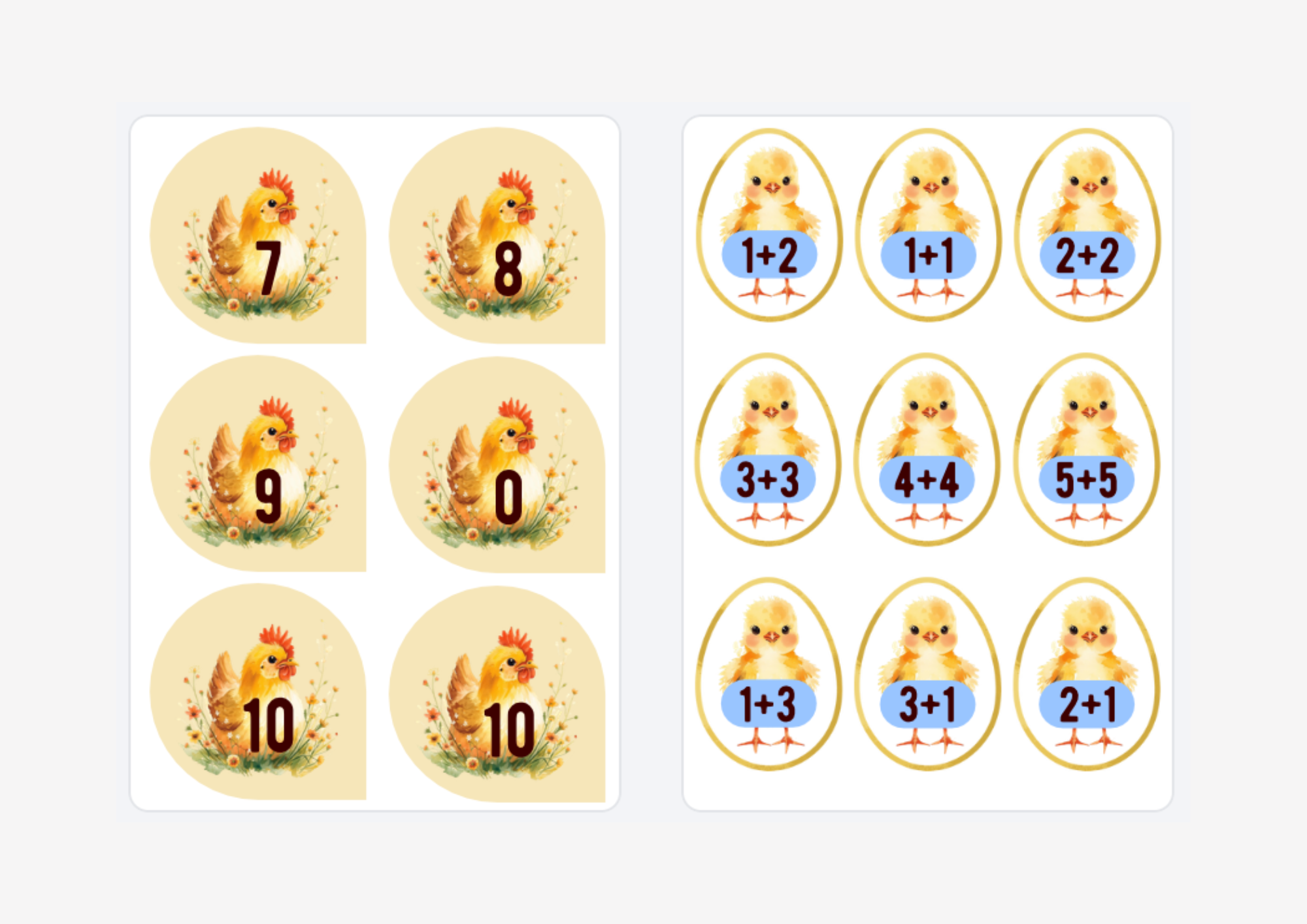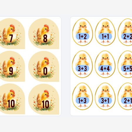 Didaktická hra na matematiku pre 1. ročník ZŠ. Zábavná aktivita na precvičovanie sčítania a odčítania v obore do 10. Žiaci počítajú príklady na kuriatkach a priraďujú ich k správnej sliepočke s výsledkom. Kuriatka hľadajú svoju mamu sliepočku.
