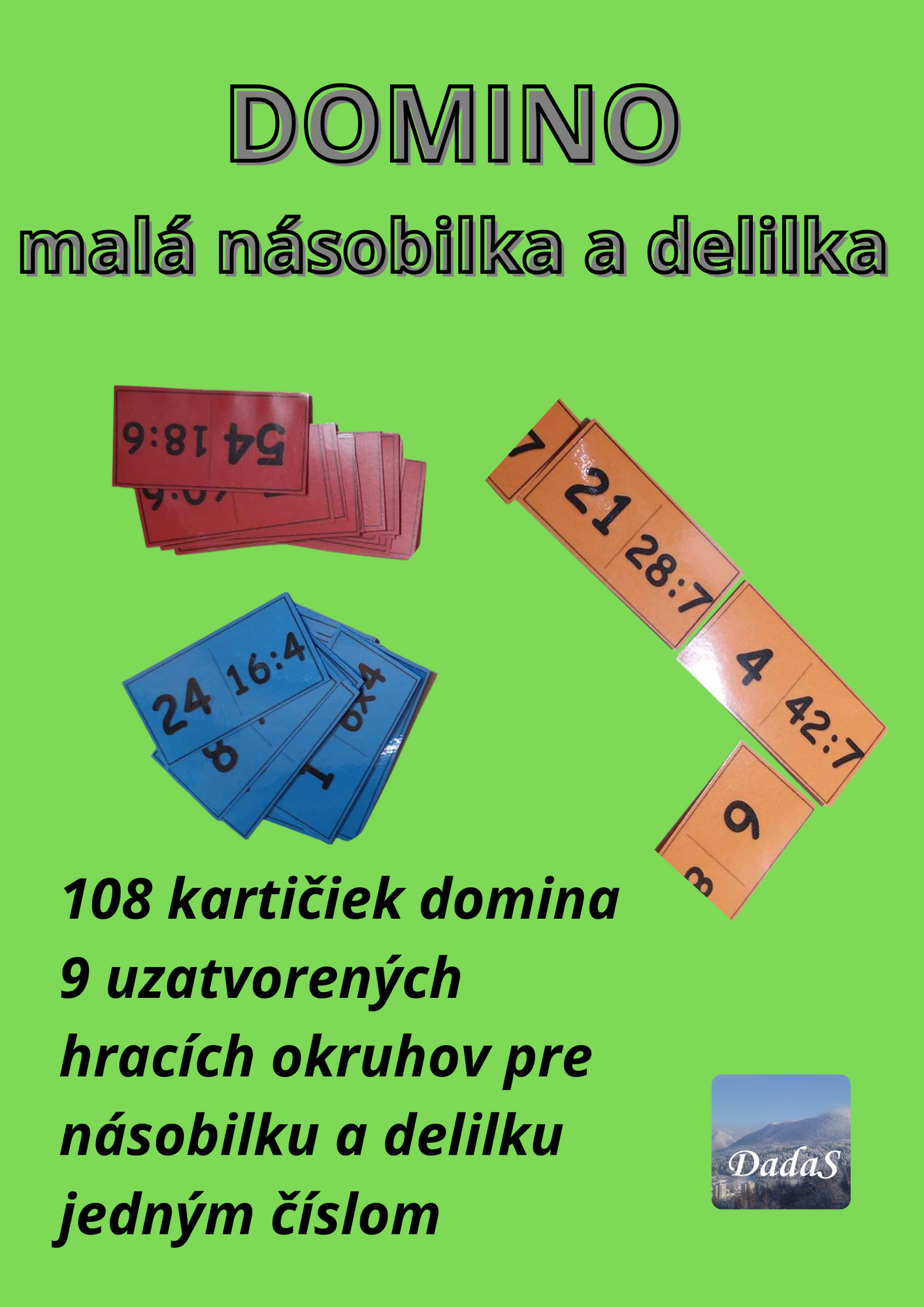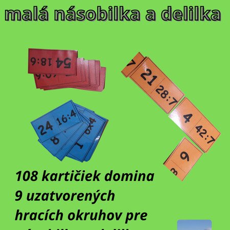 Dokument má 9 strán. Na každej strane je 12 kartičiek domina s príkladmi na násobenie a delenie jedným číslom (2 - 10) Každá strana je precvičovanie násobenia a delenia jedným číslom. Jedno domino-strana tvorí uzatvorený kruh. Začať hrať možno akoukoľvek kartičkou. Každú stranu som vytlačila na iný farebný papier, zalaminovala, nastrihala. Jednotlivé časti sa nepomiešajú. Obľúbená hra pre dvojice alebo viacčlenné skupiny. Žiaci radi skladajú aj samy. Kartičky sa dajú využiť aj bez hry na opakovanie násobenia: príklad - povedz výsledok alebo číslo - ktorý príklad k nemu môže patriť? A podobne.