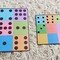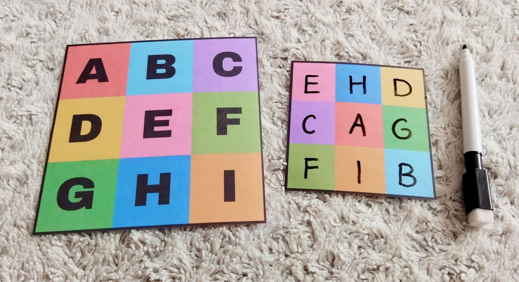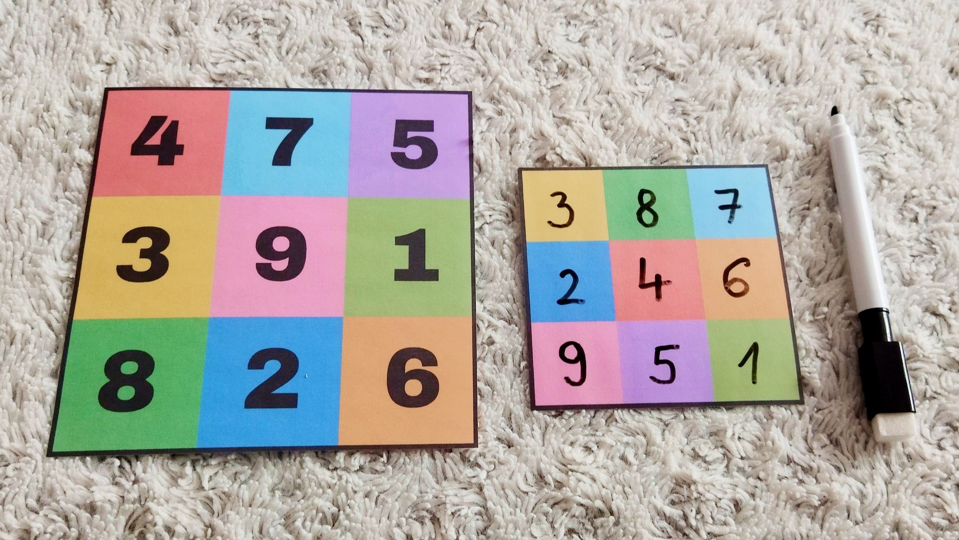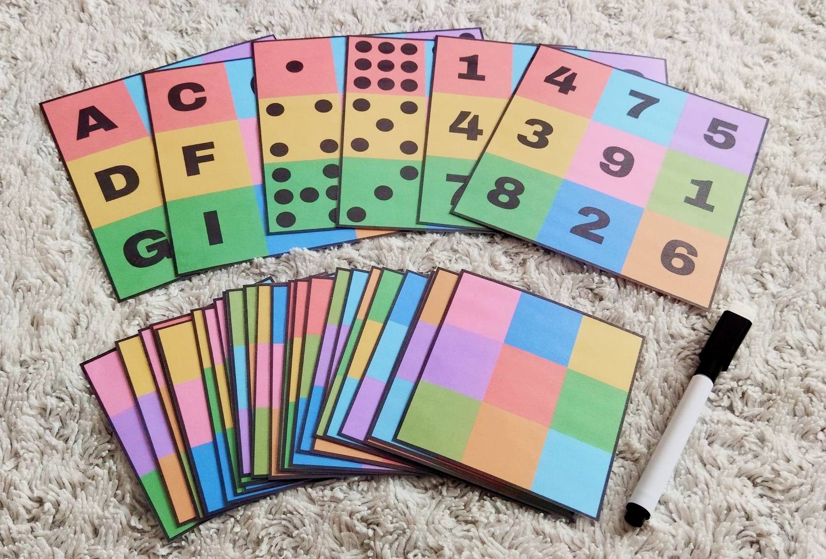 Úlohou dieťaťa je doplniť na prázdnu farebnú kartičku písmenká, čísla alebo bodky podľa predlohy.