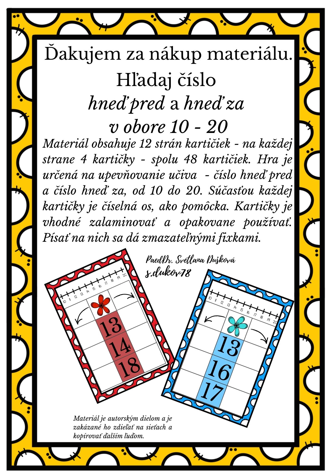 Materiál obsahuje 12 strán kartičiek - na každej strane 4 kartičky - spolu 48 kartičiek. Hra je určená na upevňovanie učiva - číslo hneď pred a číslo hneď za, od 10 do 20. Súčasťou každej kartičky je číselná os, ako pomôcka. Kartičky je vhodné zalaminovať a opakovane používať. Písať na nich sa dá zmazateľnými fixkami.