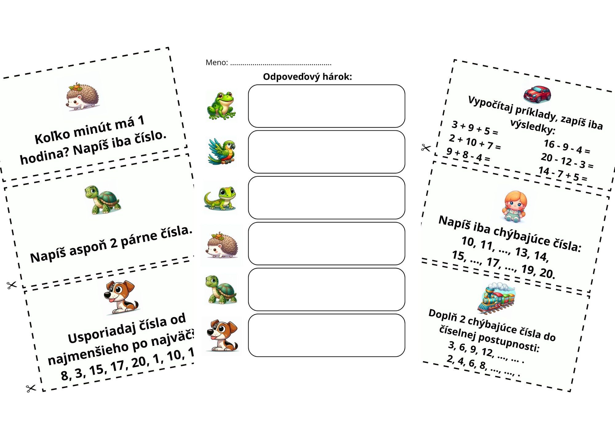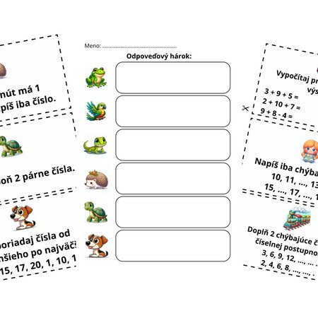 Jednotlivé úlohy rozstriháte a rozmiestnite po triede. Žiaci úlohy hľadajú a odpovede zapisujú do odpoveďového hárka. Môžu pracovať samostatne, aj vo dvojiciach. Pri každej úlohe je obrázok, odpoveď musia zapísať k rovnakému obrázku.