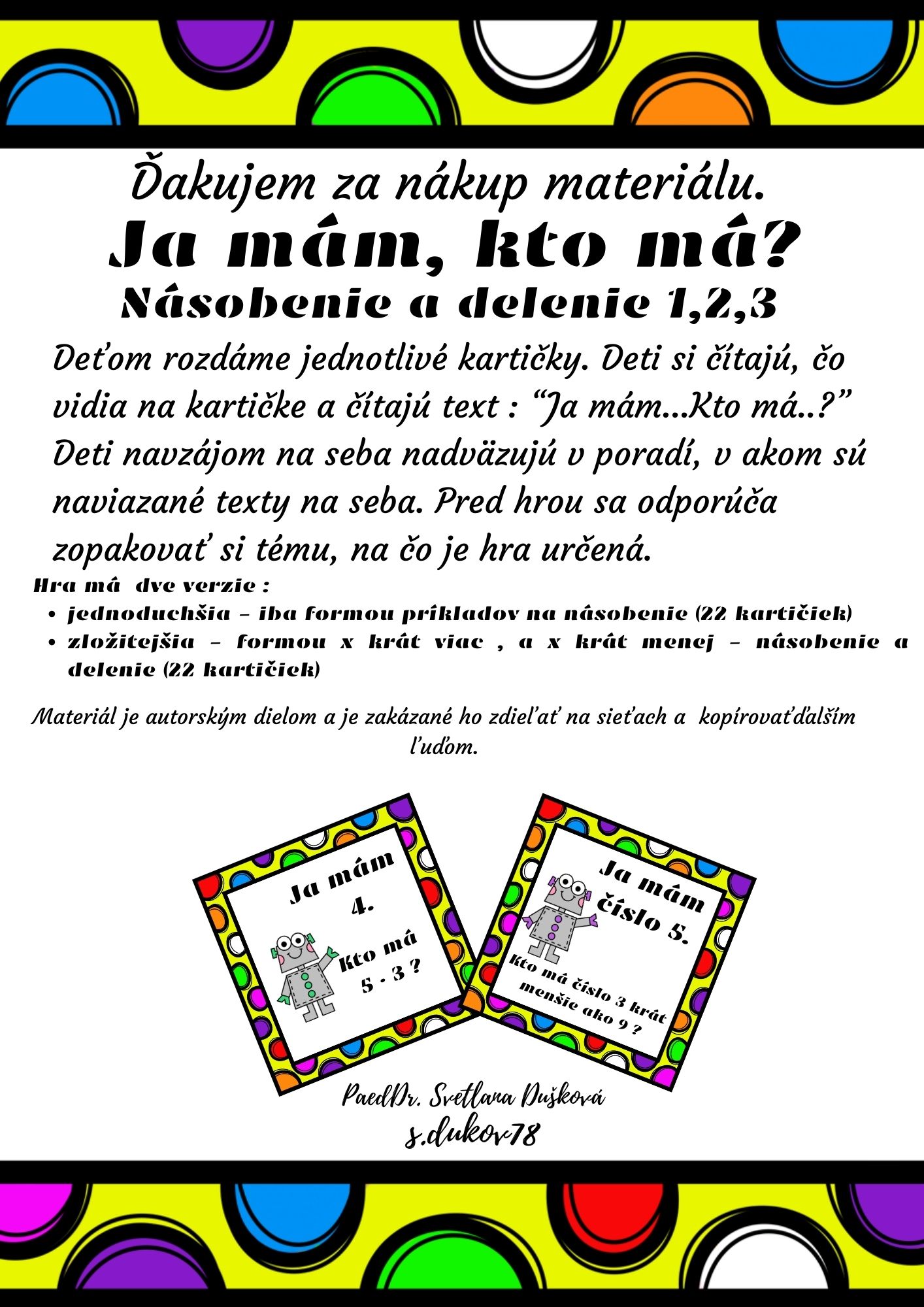 Deťom rozdáme jednotlivé kartičky. Deti si čítajú, čo vidia na kartičke a čítajú text :“Ja mám...Kto má..?”Deti navzájom na seba nadväzujú v poradí, v akom sú naviazané texty na seba. Pred hrou sa odporúča zopakovať si tému, na čo je hra určená.