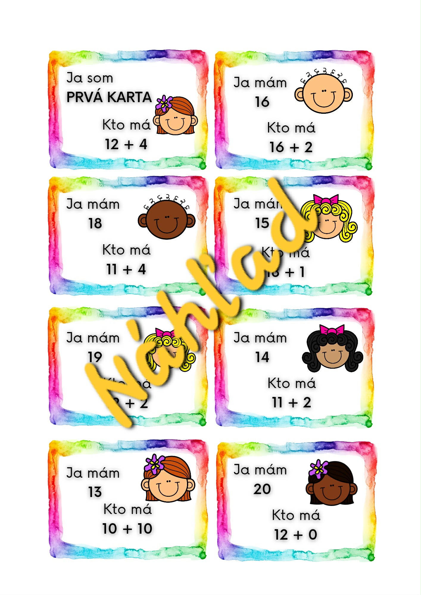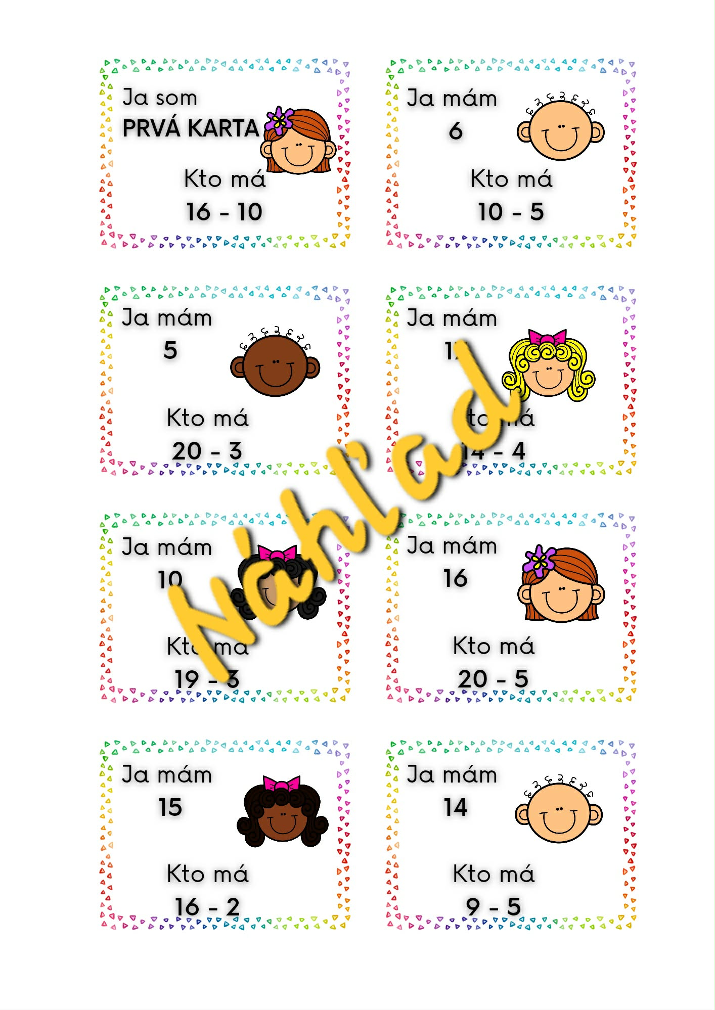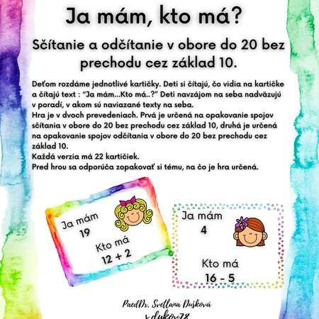 Deťom rozdáme jednotlivé kartičky. Deti si čítajú, čo vidia na kartičke a čítajú text : “Ja mám...Kto má..?” Deti navzájom na seba nadväzujú v poradí, v akom sú naviazané texty na seba.