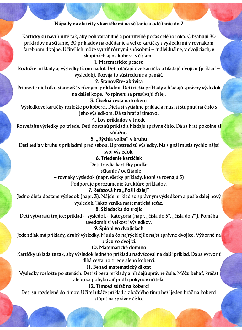 Hľadáte jednoduchý, rýchlo použiteľný a zároveň atraktívny materiál na sčítanie a odčítanie do 7? Tento set je presne to, čo potrebujete. Nájdete v ňom 60 minimalistických, farebných a prehľadných kartičiek, s ktorými môžete učiť tradične, pohybovo aj zážitkovo. Deti udržia pozornosť dlhšie, pracujú aktívnejšie a Vy získate množstvo možností, ako z jednej pomôcky vytvoriť desiatky rôznych aktivít.