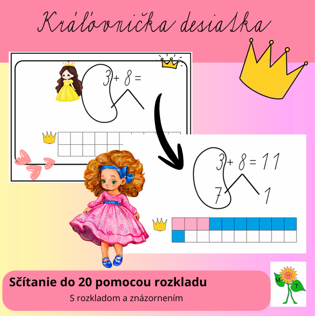 Karty vo veľkosti A5 sú určené na vyvodenie a nácvik sčítania s prechodom cez desiatku pomocou rozkladu. Základom je hľadanie „kráľovničky desiatky“, ktorá nám so sčítaním pomôže. Riešenia môžu deti znázorniť do štvorcovej siete. Na druhej strane je priložené riešenie na rýchlu kontrolu.