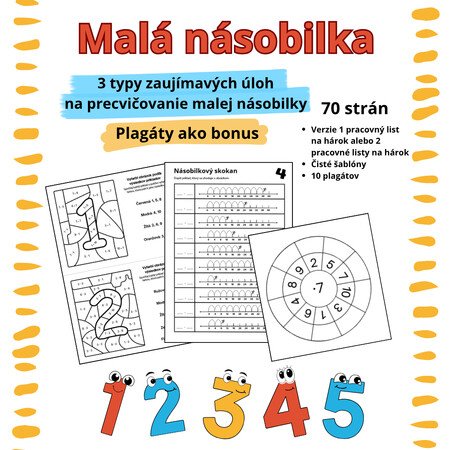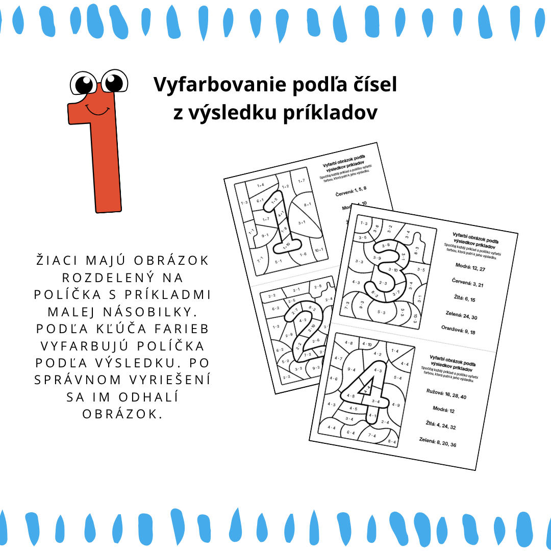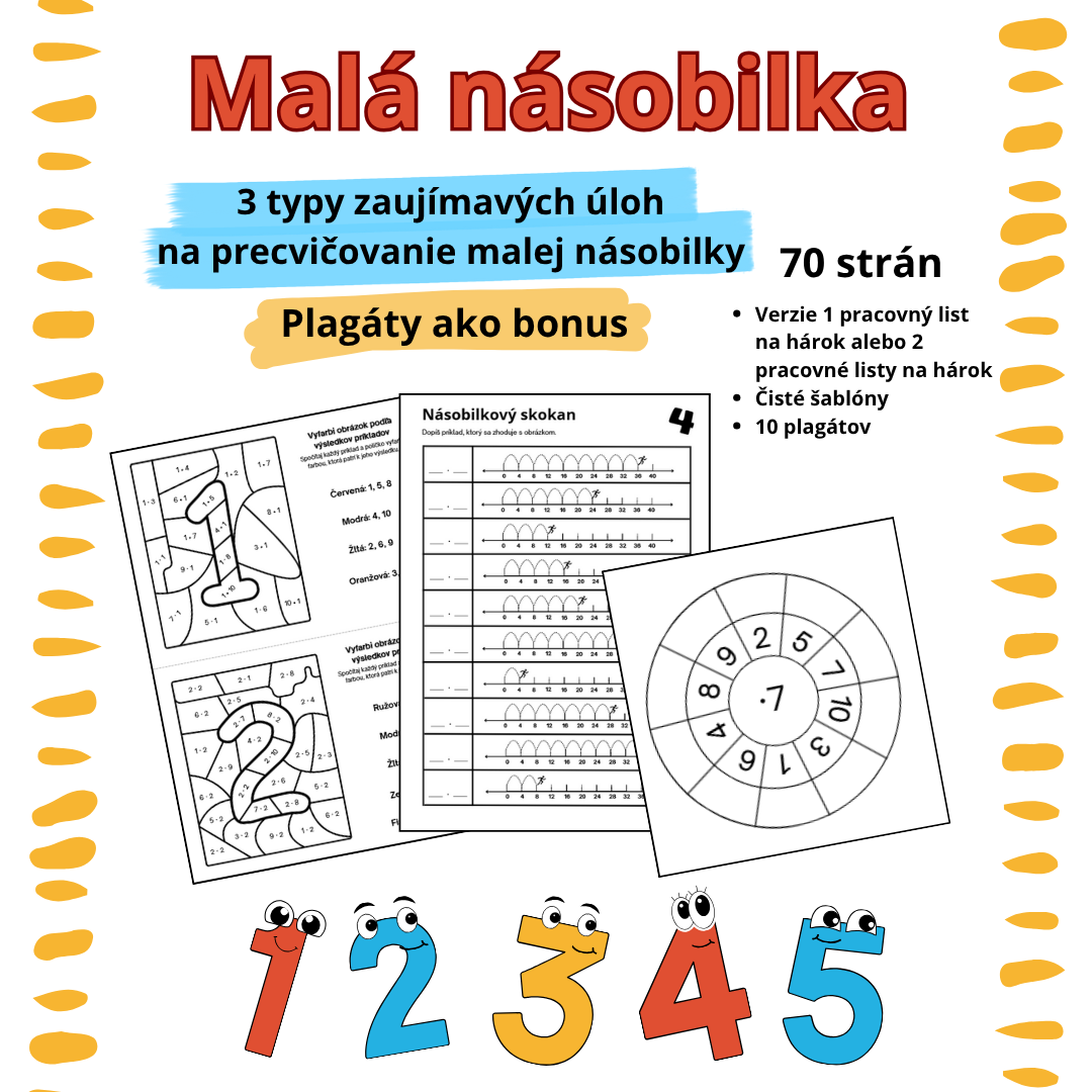 Tento balíček prináša tri zábavné typy úloh, ktoré pomáhajú deťom upevniť si malú násobilku hravou formou. Žiaci pri nich počítajú, tvoria, vymaľúvajú a zároveň sa učia vnímať násobilku ako niečo zábavné a tvorivé.