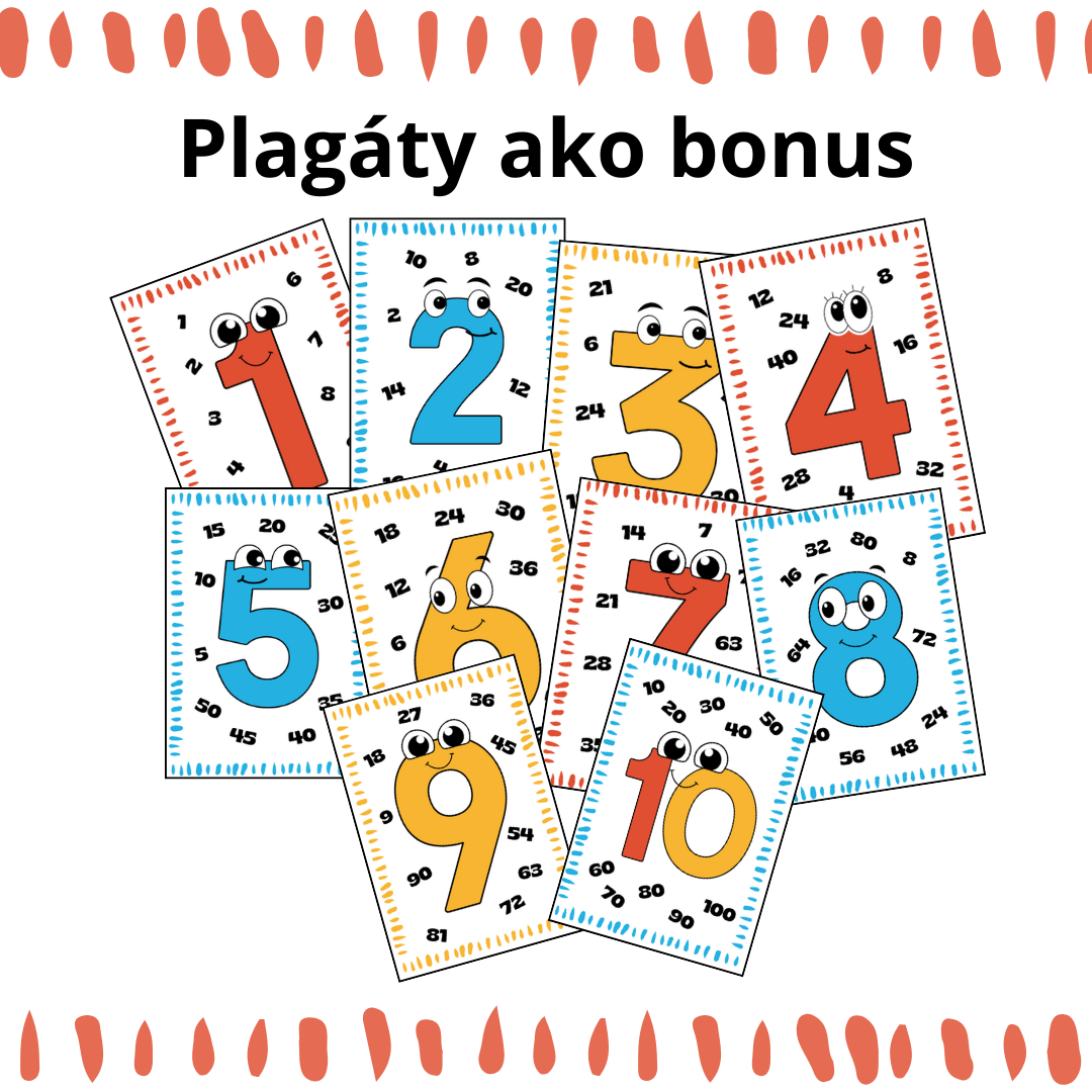 Súčasťou balíčka je 10 plagátov vhodných na výzdobu triedy. Na každom plagáte je jedno číslo od 1 do 10 a okolo neho „levitujú“ jeho násobky.