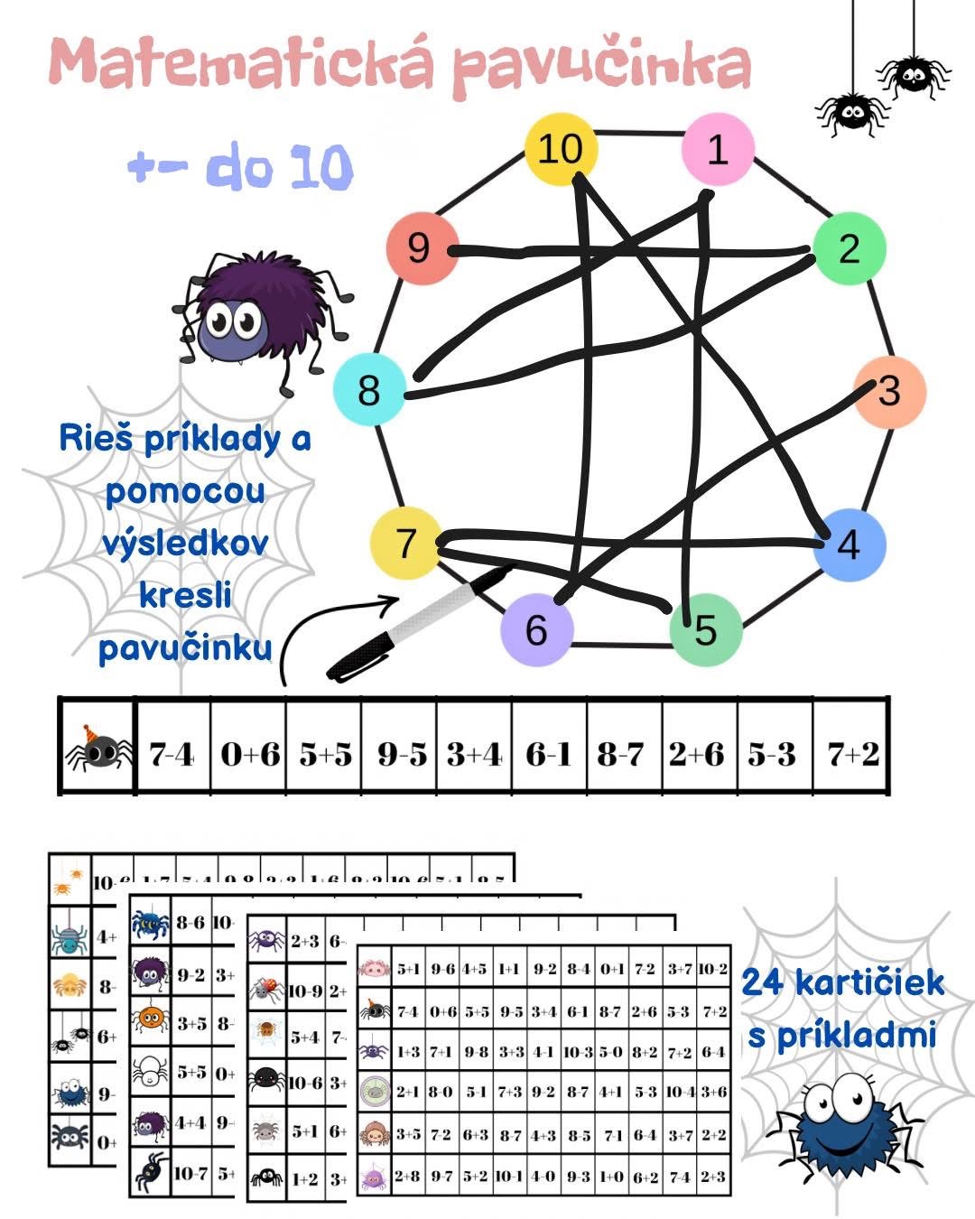 Zábavná aktivita na precvičenie sčítania a odčítania do 10. Deti riešia príklady a podľa výsledkov postupne kreslia pavučinku. Súčasťou je hrací plán a 24 kartičiek s príkladmi, vďaka ktorým si hravou formou upevnia počítanie.