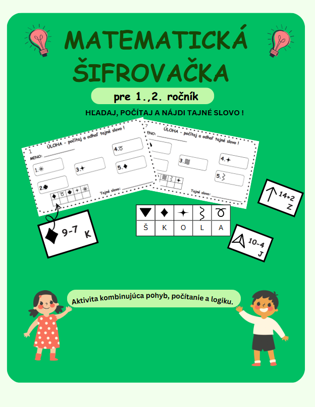 Deti sa pohybujú po triede, riešia príklady do 20 (bez prechodu cez základ) a pomocou výsledkov odhaľujú tajné slovo.