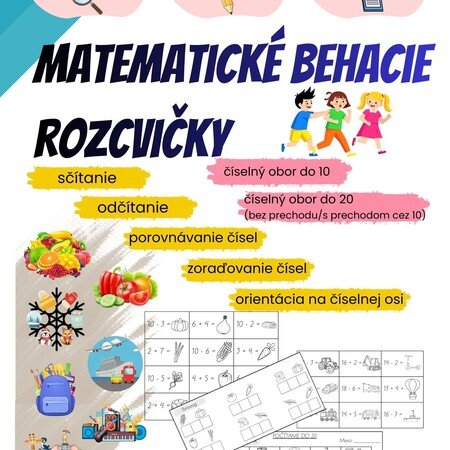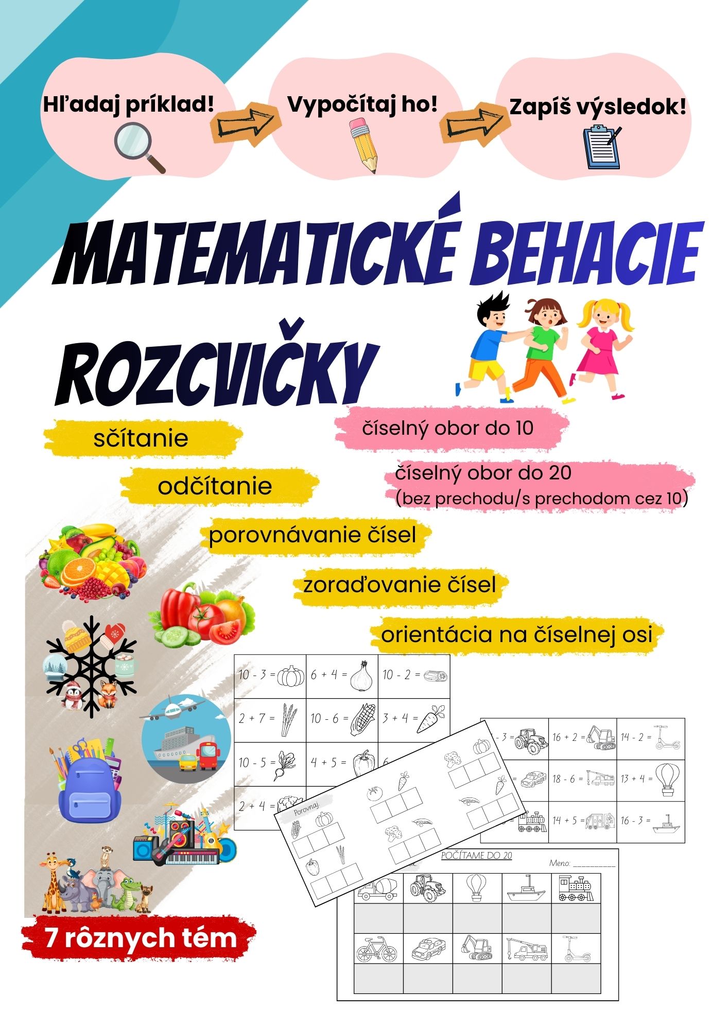 Matematické behacie rozcvičky sú hravý a pohybový materiál určený pre žiakov 1. a 2. ročníka, ktorý prepája precvičovanie matematiky s aktívnym pohybom. Deti hľadajú v priestore rozmiestnené kartičky s príkladmi, počítajú v číselnom obore do 10 a do 20 (s prechodom aj bez prechodu cez 10) a výsledky zapisujú do svojho pracovného listu.