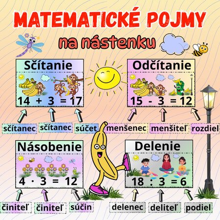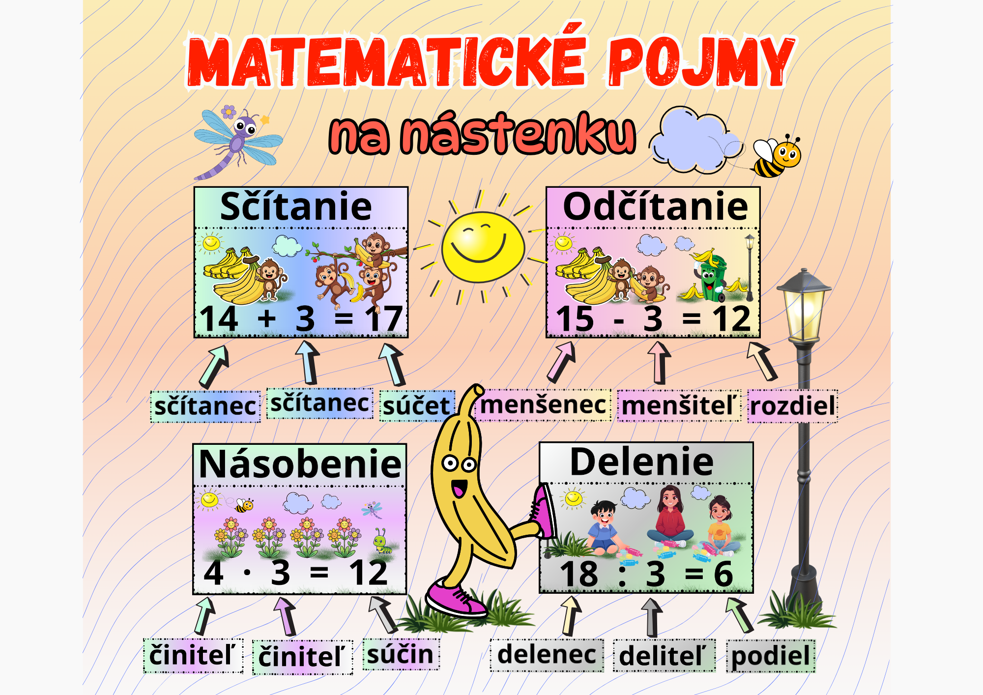 Tieto farebné a prehľadné plagáty pomáhajú deťom jednoducho pochopiť základné matematické operácie, podporujú vizuálne učenie a lepšie zapamätanie.