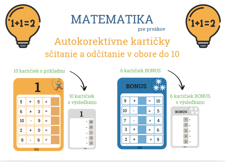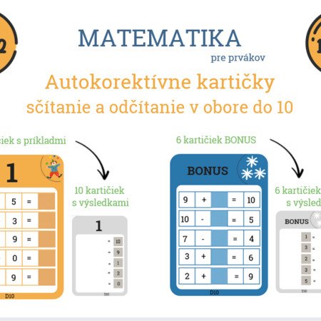 😊 Autokorektívne kartičky sú skvelou pomôckou, ktorá zábavnou a zároveň účinnou formou pomáha prvákom upevňovať sčítanie a odčítanie v obore do 10. Sú navrhnuté tak, aby deti dokázali pracovať samostatne – správne riešenia na zadnej strane poskytujú okamžitú spätnú väzbu a podporujú ich sebadôveru pri učení.