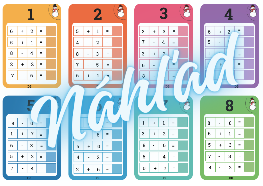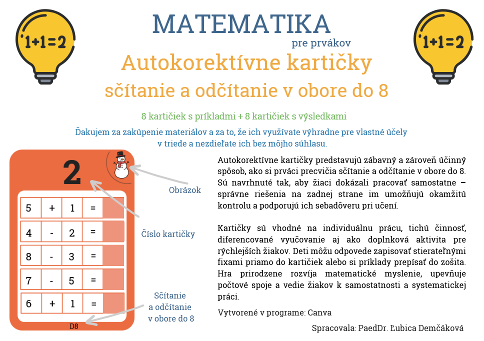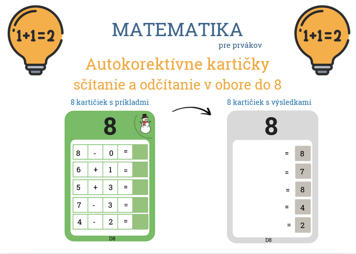 Autokorektívne kartičky predstavujú zábavný a zároveň účinný spôsob, ako si prváci precvičia sčítanie a odčítanie v obore do 8. Sú navrhnuté tak, aby žiaci dokázali pracovať samostatne – správne riešenia na zadnej strane im umožňujú okamžitú kontrolu a podporujú ich sebadôveru pri učení.