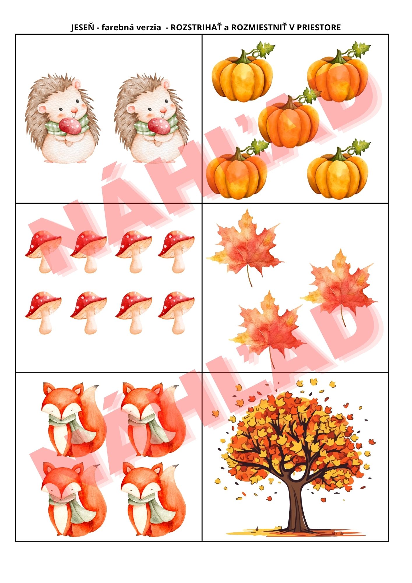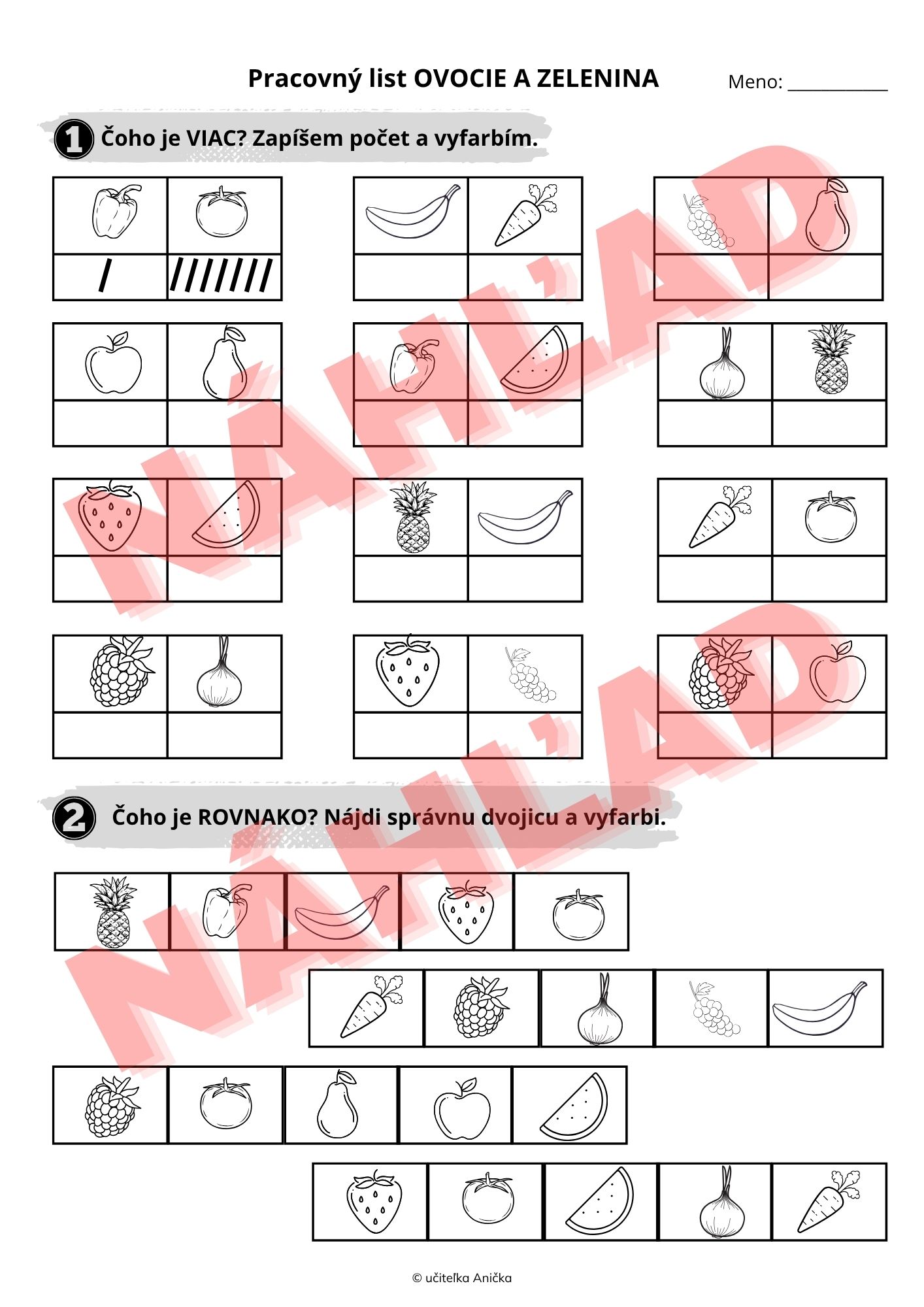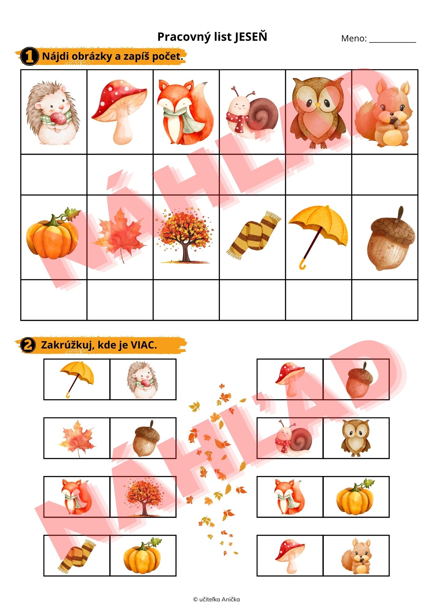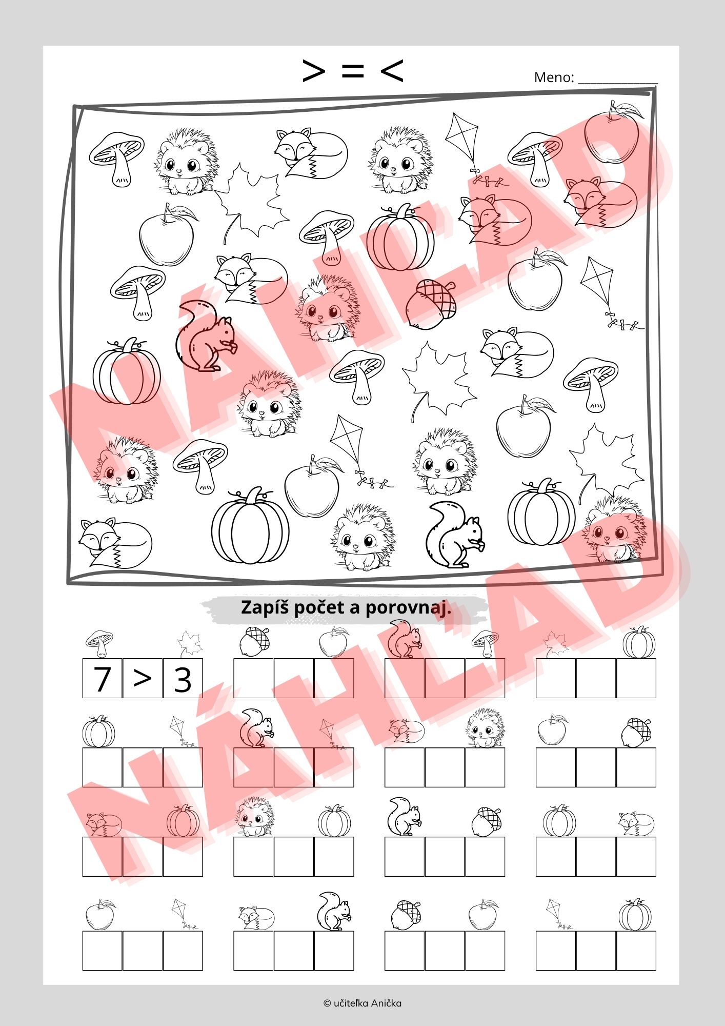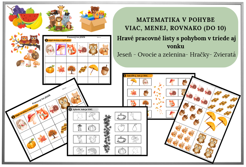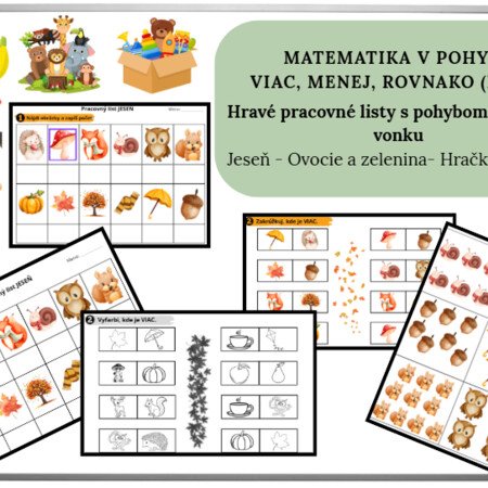 Materiál ponúka hravé pracovné listy (v čiernobielej aj farebnej verzii) na porovnávanie počtov a upevňovanie pojmov viac, menej a rovnako v číselnom obore do 10. Súčasťou materiálu sú obrázky, ktoré je možné rozmiestniť po triede alebo vonku – deti ich hľadajú, počítajú a zapisujú zistené množstvá do pracovného listu. Učenie sa tak mení na zážitkovú, pohybovú aktivitu, ktorá spája matematiku s objavovaním a spoluprácou. Témou sú Jeseň, Ovocie a zelenina, Hračky a Zvieratá.